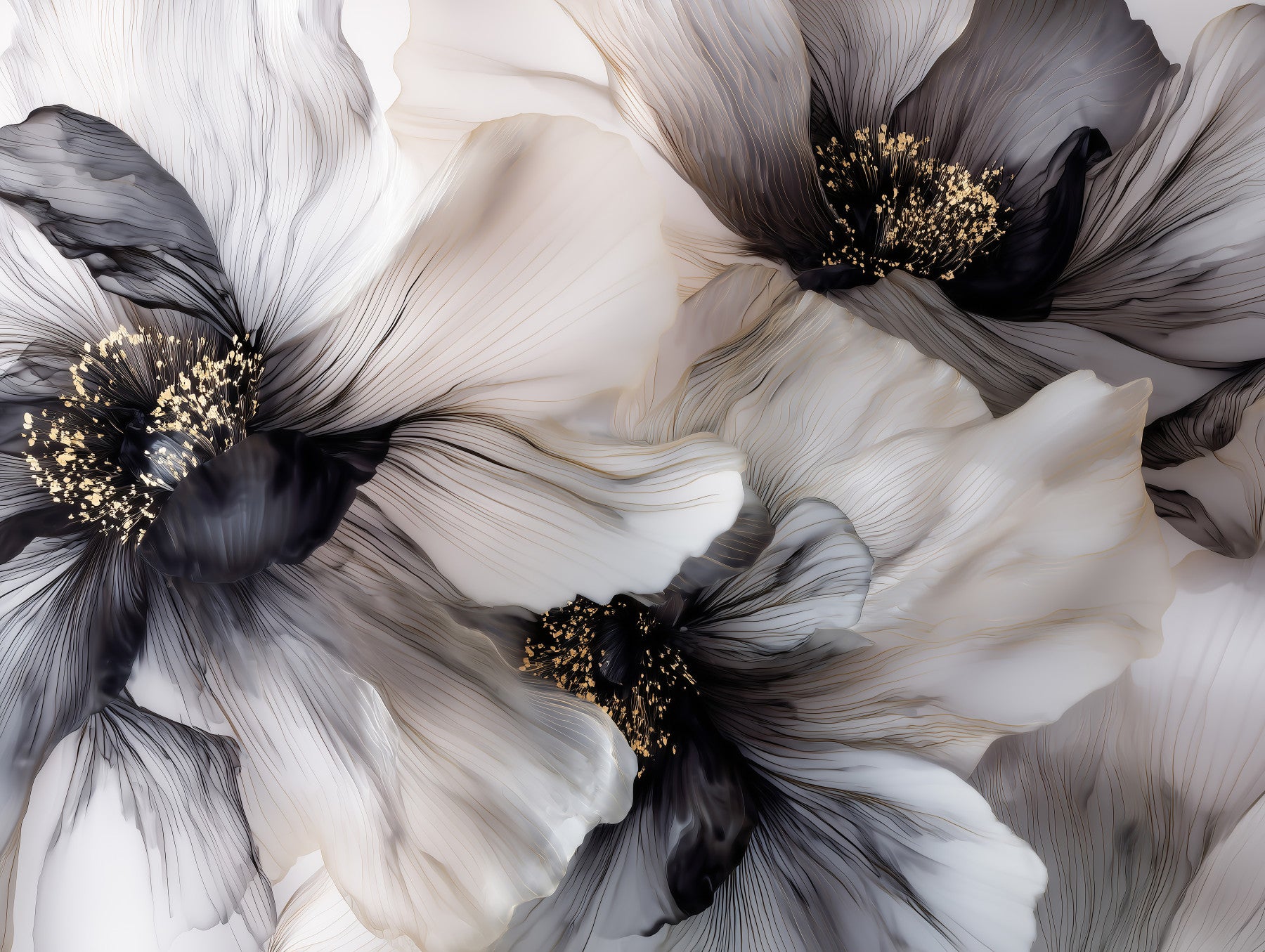 Immerse yourself in the ethereal beauty of 'Monochrome Petal Ink Flow Harmony,' a mesmerising wallpaper that blends the delicacy of floral art with the bold strokes of ink painting. This design features abstract floral forms, meticulously rendered in a sophisticated grayscale palette with delicate gold stamen. The petals unfurl with a fluid grace, their textures brought to life through subtle gradations of tone, creating a sense of depth and movement. The intentional use of negative space enhances the organic shapes, allowing the eye to wander through a landscape of swirling petals and inky tendrils. The gold accent in the stamens adds a touch of luxury to the piece. This wallpaper evokes a sense of tranquility and modern elegance, making it an ideal backdrop for any space seeking a touch of artistic sophistication. Let the 'Monochrome Petal Ink Flow Harmony' transform your digital environment into a serene sanctuary of artful expression.