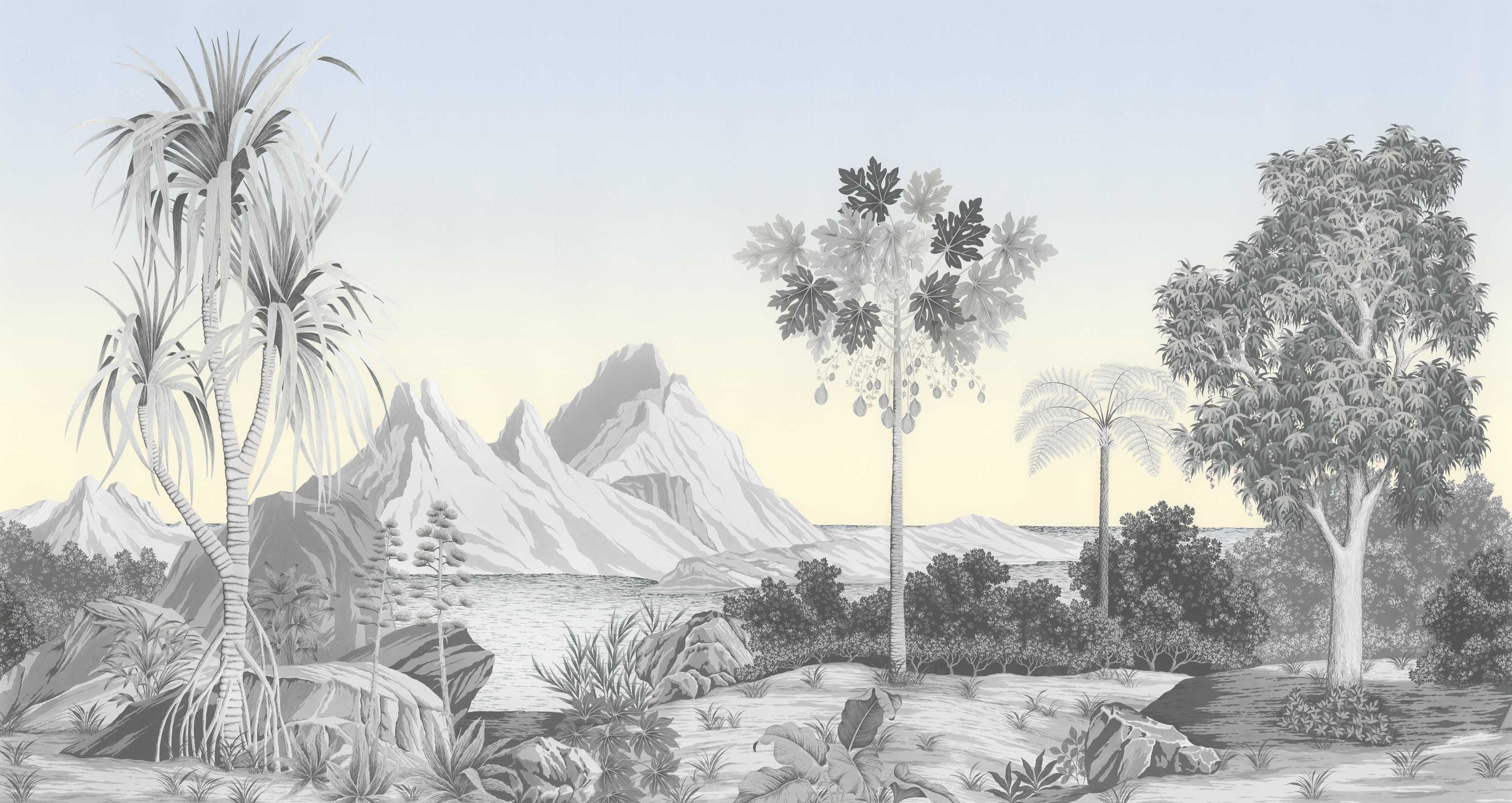 Monochrome botanical wallpaper with tropical landscape design