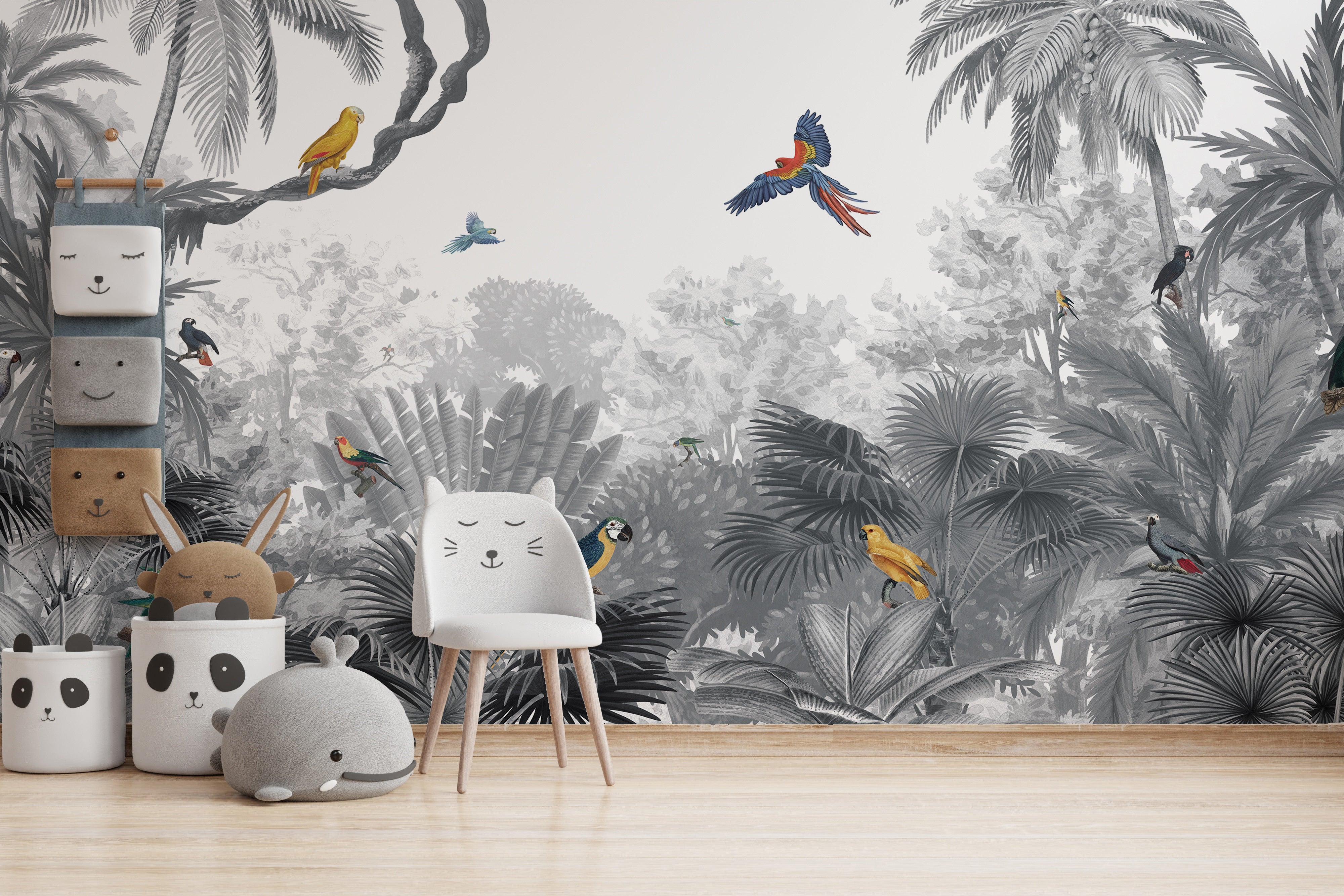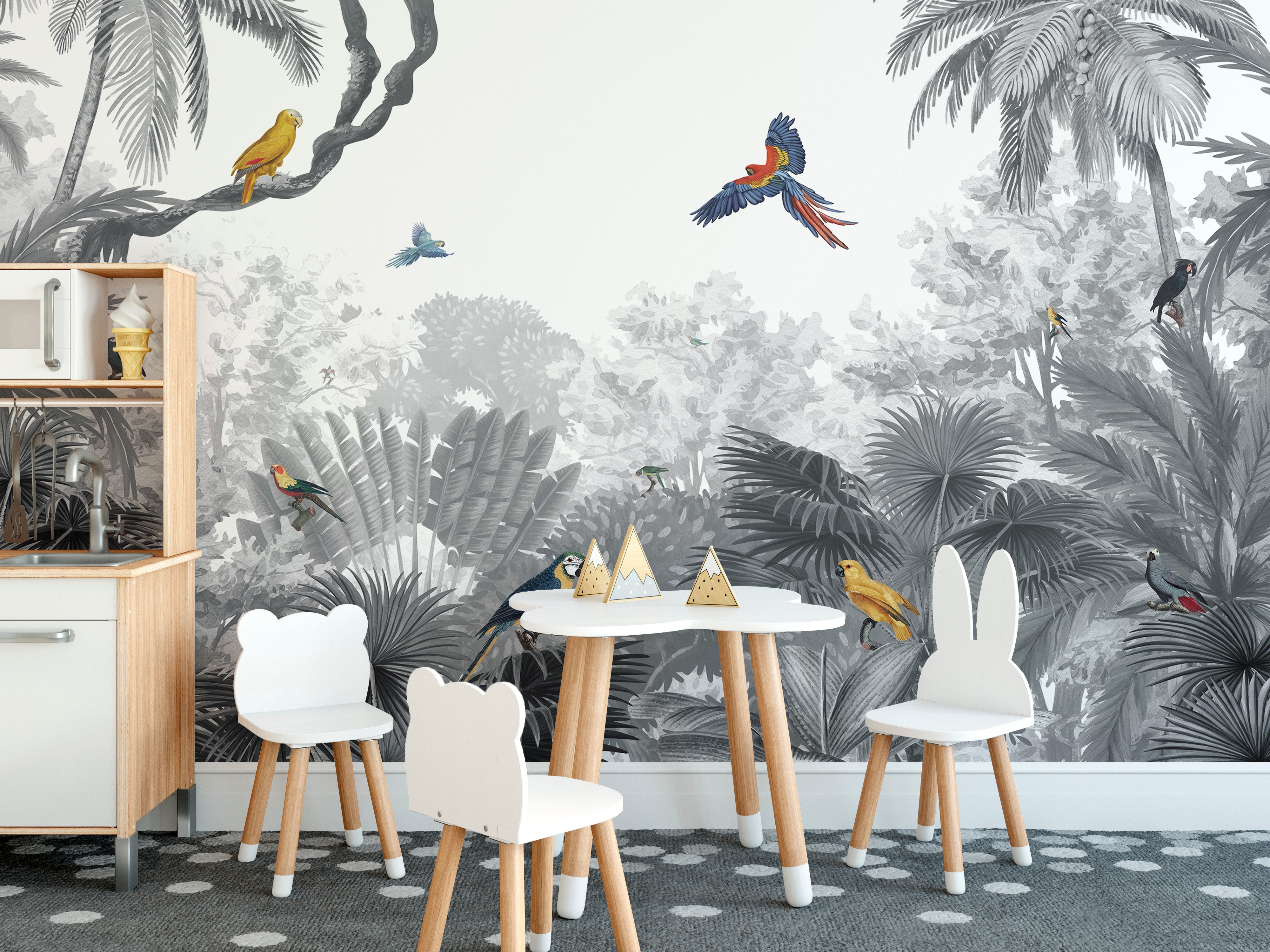 Tropical wallpaper mural featuring birds and grayscale jungle
