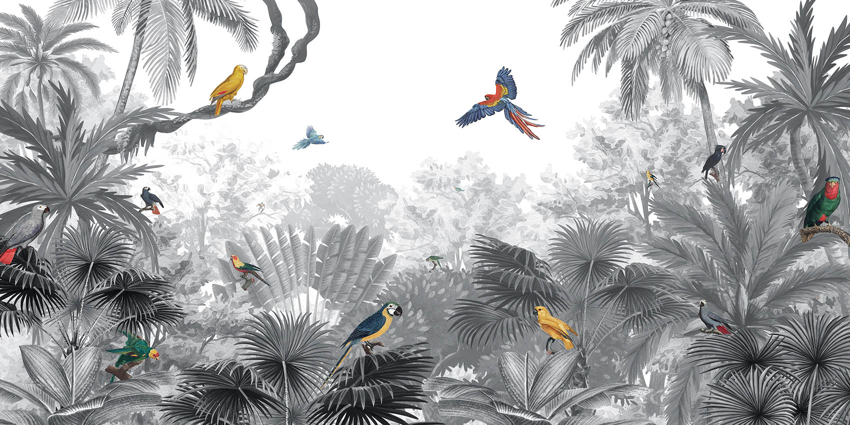 Jungle-themed wallpaper with colorful birds in monochrome