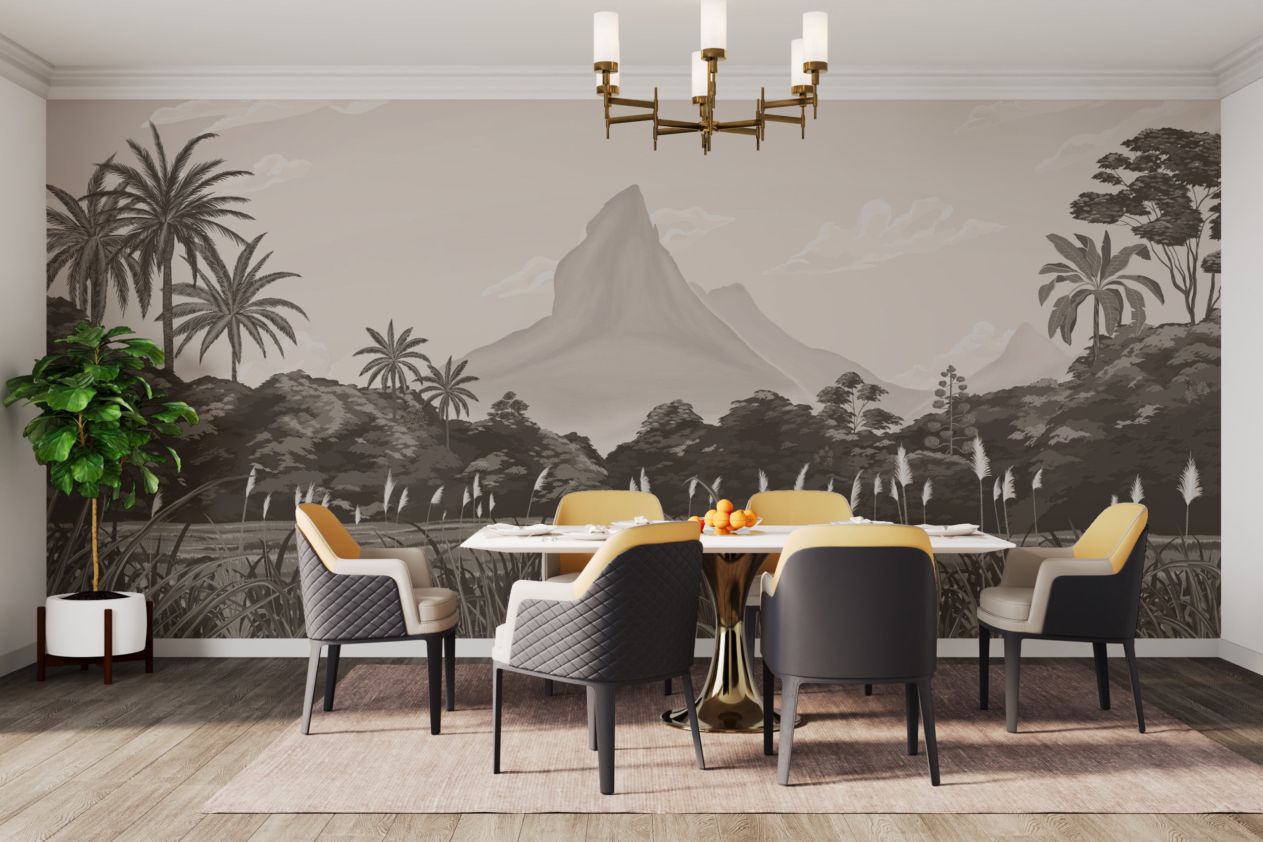 Transform your home into an oasis of nature with the monochrome tropical jungle wall mural, a stunning juxtaposition of asceticism and beauty. With a background of a tropical jungle nature scene wallpaper and a black and white mountain fill scene, this mural gives the room depth and peace. The vintage forest wall art design provides a classic look suitable for modern interior decoration. Made of premium materials, it guarantees it is robust and straightforward to install. Improve your decor using this peaceful nature wall mural, which adds the serenity of a quiet jungle panoramic wallpaper to your home. An ideal wallpaper for living, office, and bedroom environments, this botanical nature scene wallpaper is a must-have for nature fans.