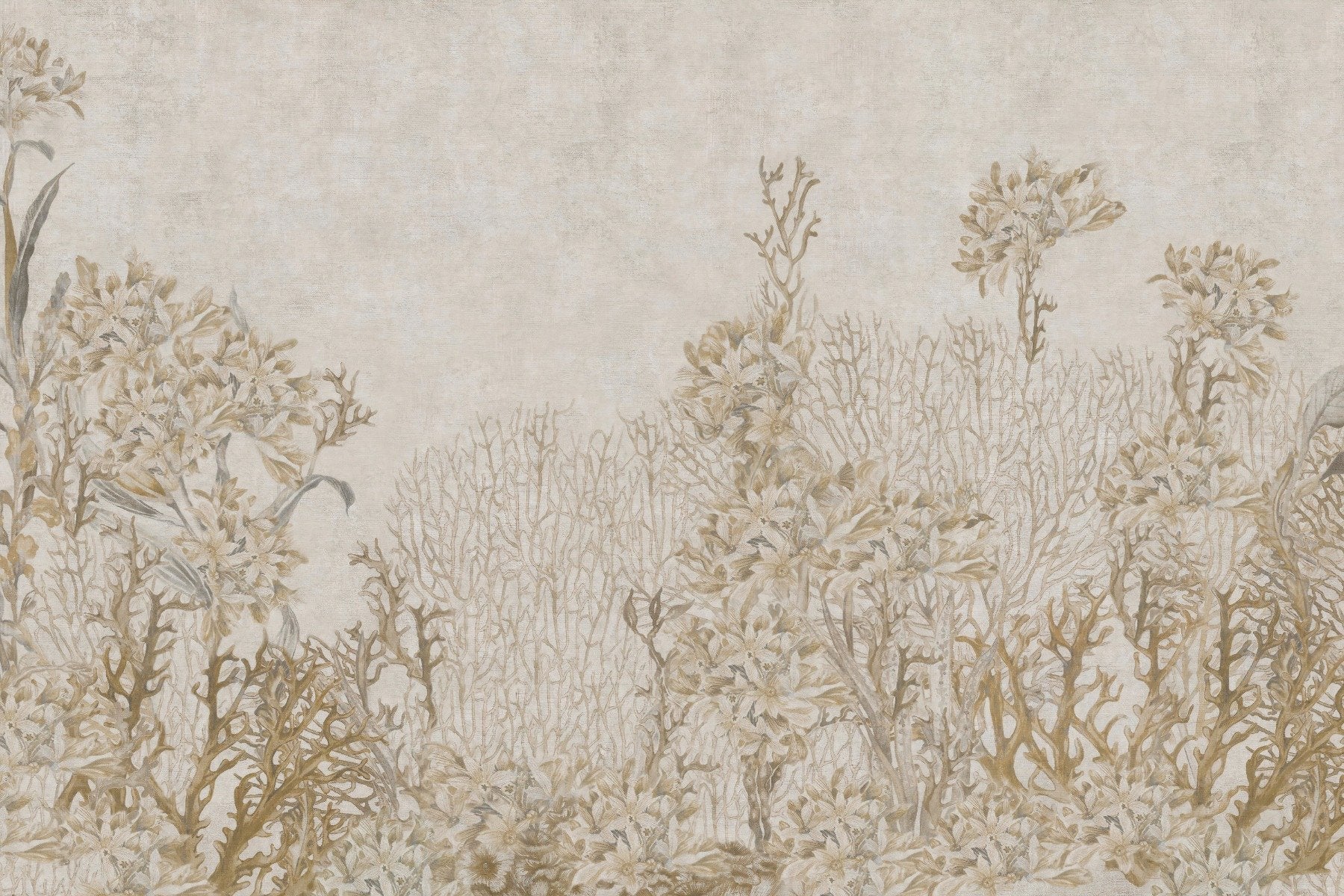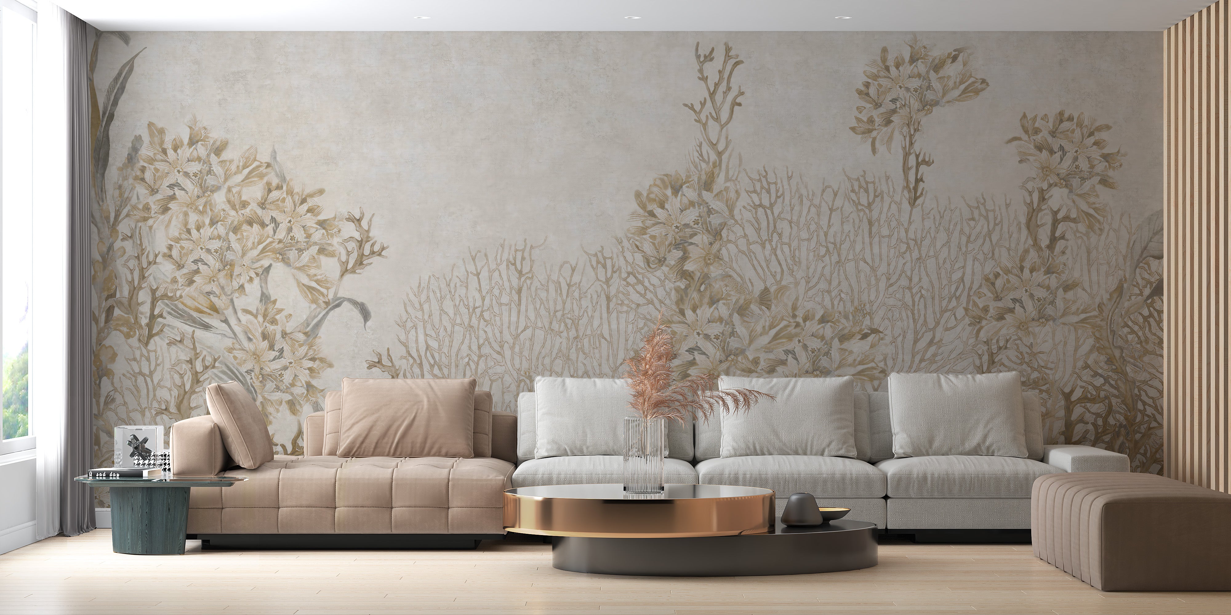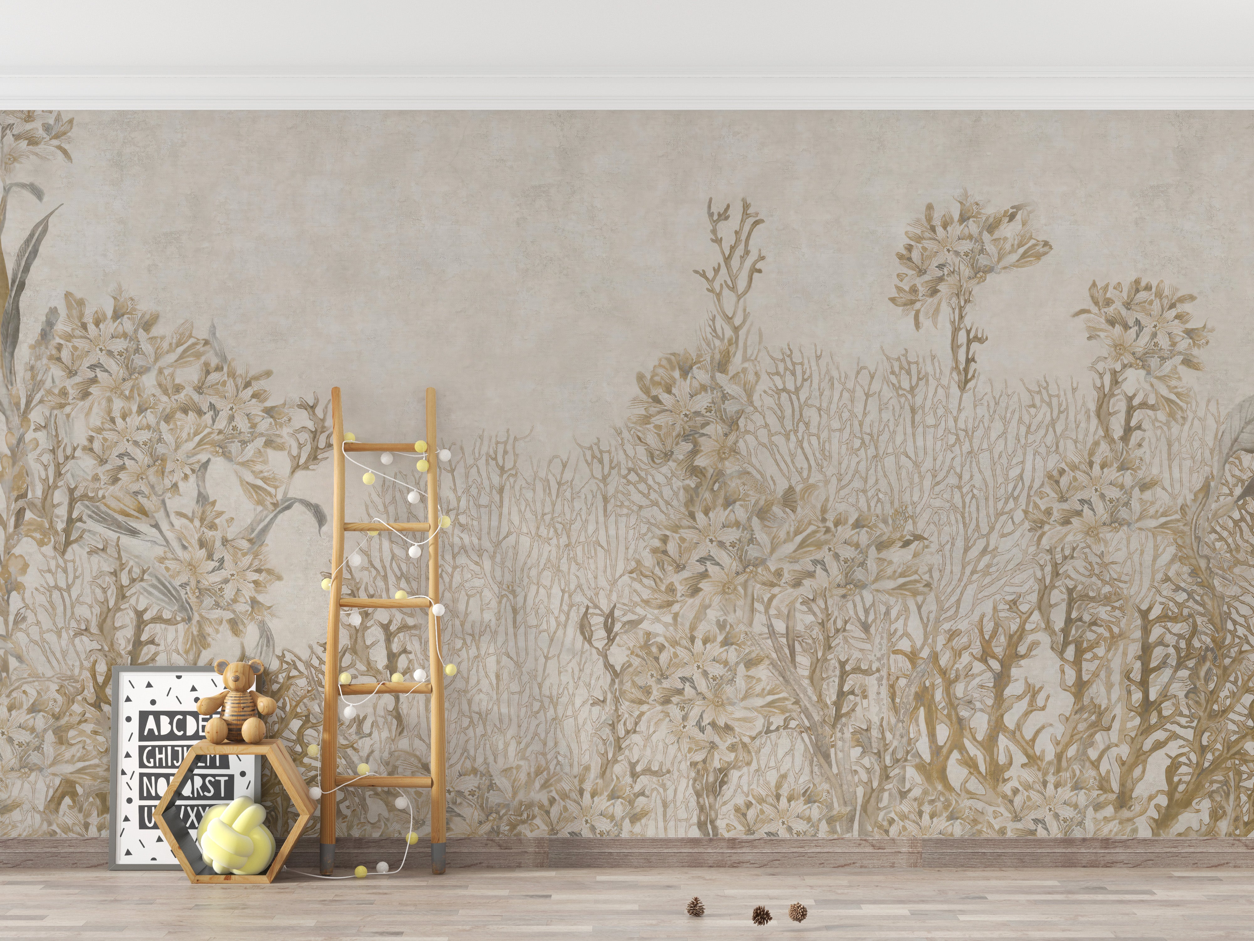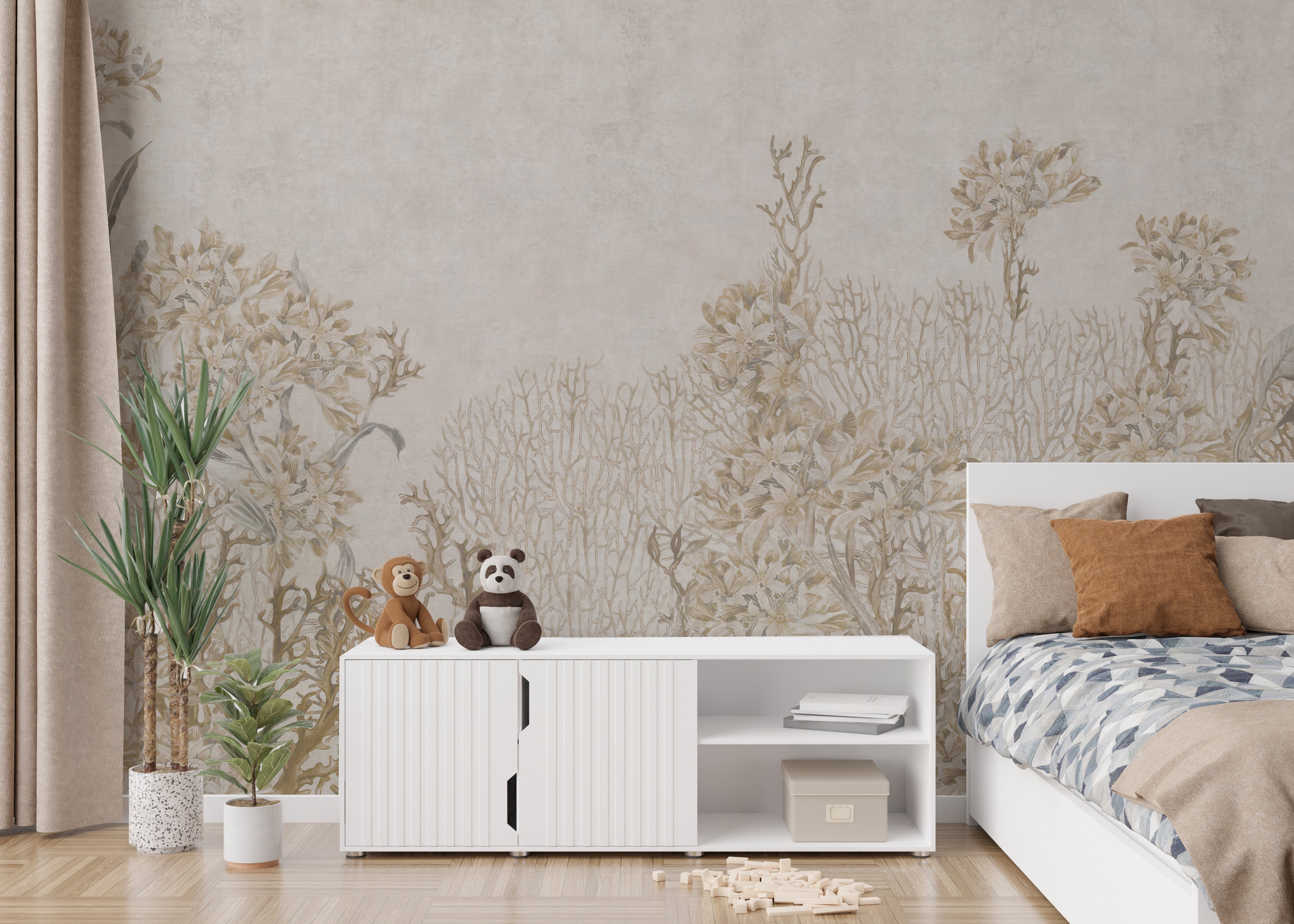 With its serene sepia tones and a touch of tropical paradise, the mural effortlessly becomes the centerpiece of any room. The sophisticated color palette, featuring warm natural hues complemented by light grey lines, invites a sense of calm and warmth into your space. Perfect for enhancing the ambiance of bedrooms, living areas, or hallways, this flower peel and stick wallpaper delivers an understated yet impactful statement.