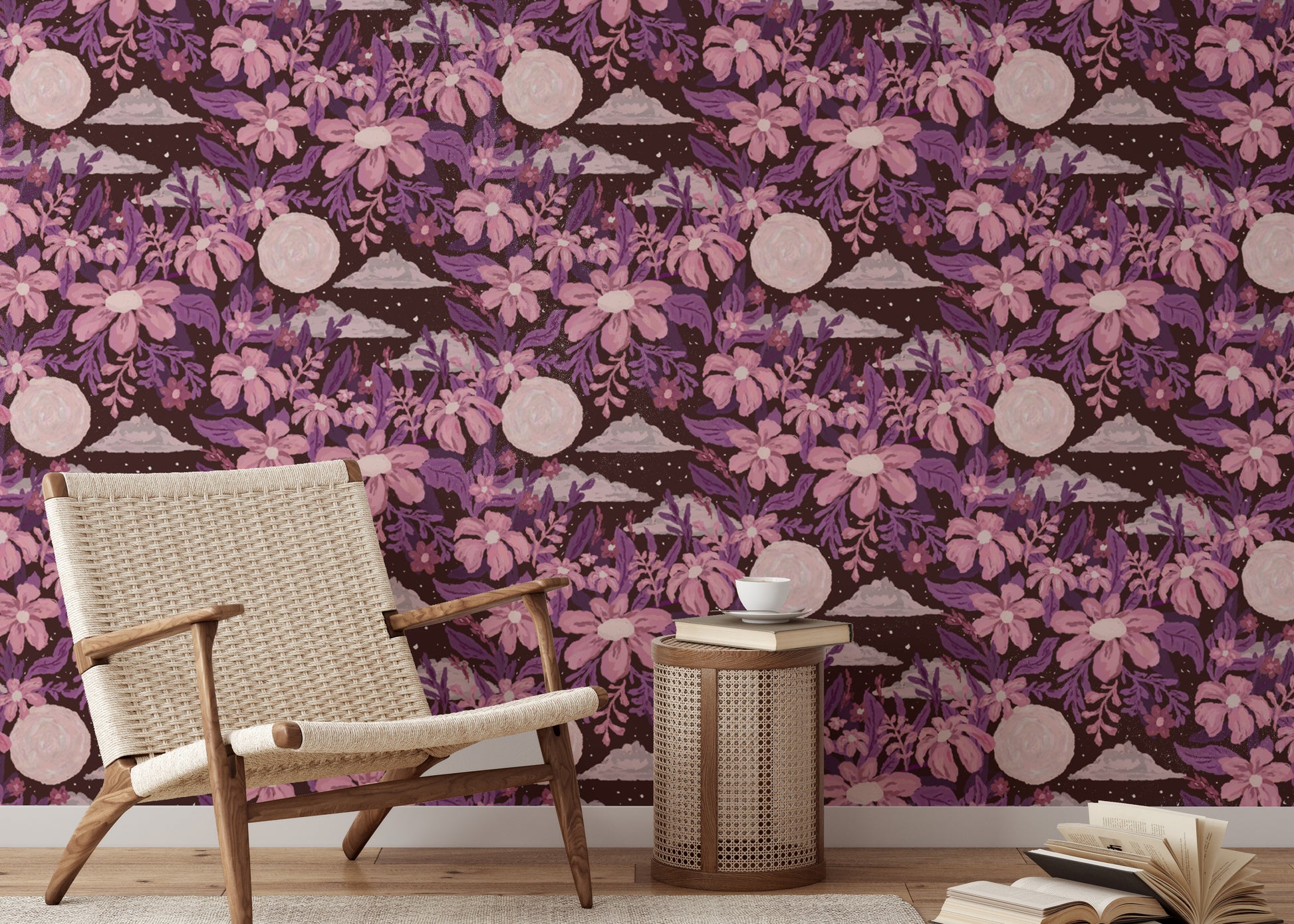 Lunar charm with purple floral wallpaper