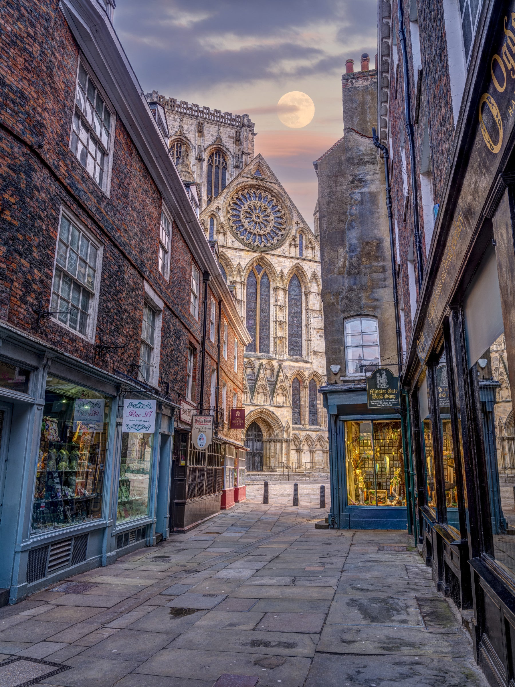 Wall mural with a moon over a charming street.