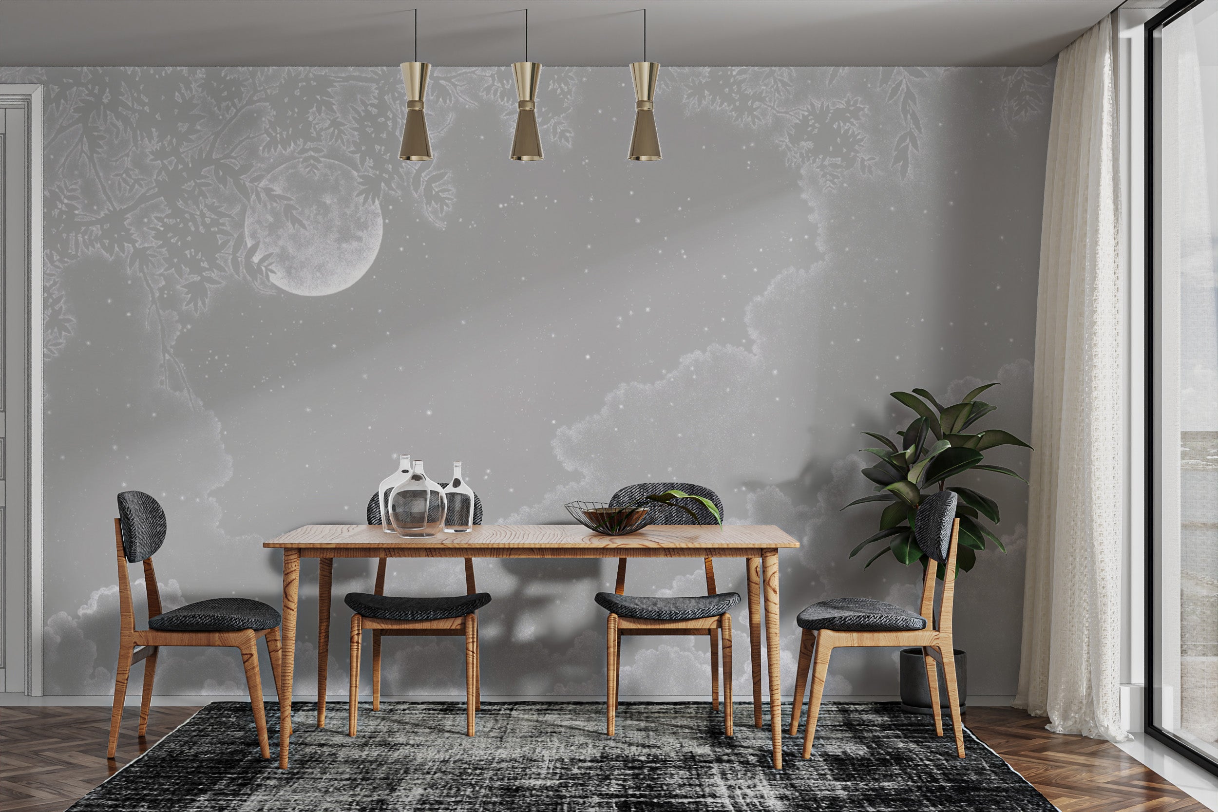 Reimagine your space with the moonlit starry night sky mural, a mesmerizing combination of moonlit night sky wallpaper and mystical night sky mural. This astral schematic includes a radiant full moon, scintillating starry night sky, and ethereal mystic clouds, and soothes the senses with a relaxing effect ideal for bedrooms, nurseries, or meditation rooms. Celestial moon wallpaper has a soft and dreamy feel to it, and fantasy sky wallpaper mural lends an ethereal effect to any room through a grayscale celestial style; up your home décor with this trending moon and clouds style masterpiece that transforms your walls into an ethereal nighttime scene. Place an order now and let the magic of the night sky come inside
