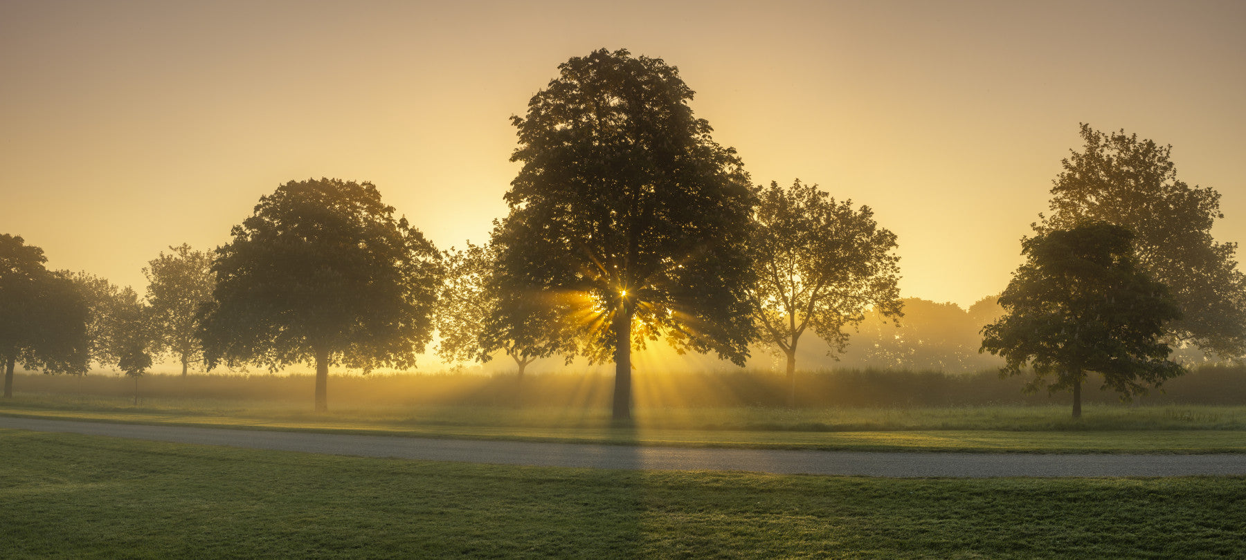 Misty sunrise in countryside, Berkshire, UK. Welcome the day with a burst of warmth and light. Glimpses of sunlight shine through a line of trees, creating a beautiful morning view. Its vibrant color palette brings the outdoors to any indoor setting. The wallpaper for walls brings tranquility into bedrooms and relaxation areas. Elevate interiors with this image, creating a serene and inviting place. Let this wallpaper offer a blend of nature and elegance.