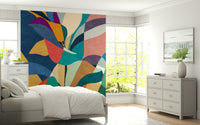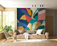 Transform your walls with this striking floral mosaic wallpaper for walls. Bold shapes and a vibrant colour palette create a visually engaging abstract pattern. Deep blues contrast with earthy tones of green, orange, red, and yellow for a unique modern design. Ideal for living rooms, dining areas, or bedrooms, the design provides a statement backdrop. It adds depth and character, complementing modern or mid-century furniture. Let this textured design become a focal point, enhancing any interior with a touch of artistic flair and energy. The mosaic structure infuses spaces with depth and modern artistic flair.