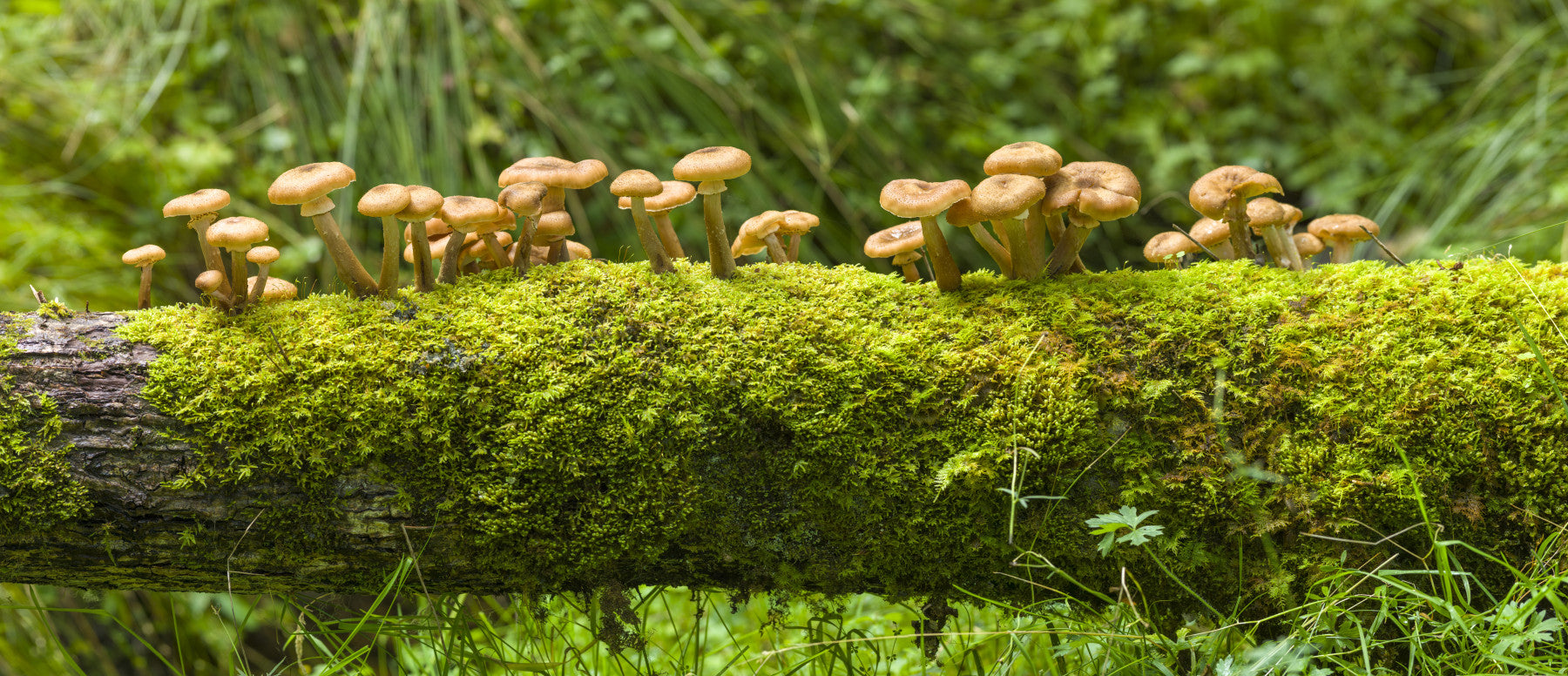 Earthy mossy log with mushrooms mural for nature lovers