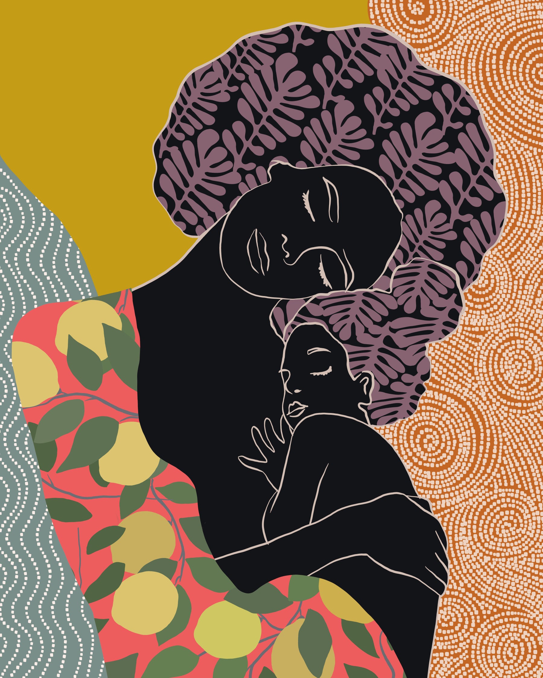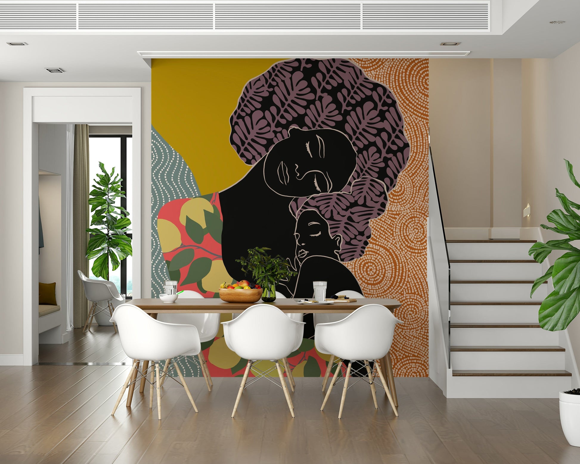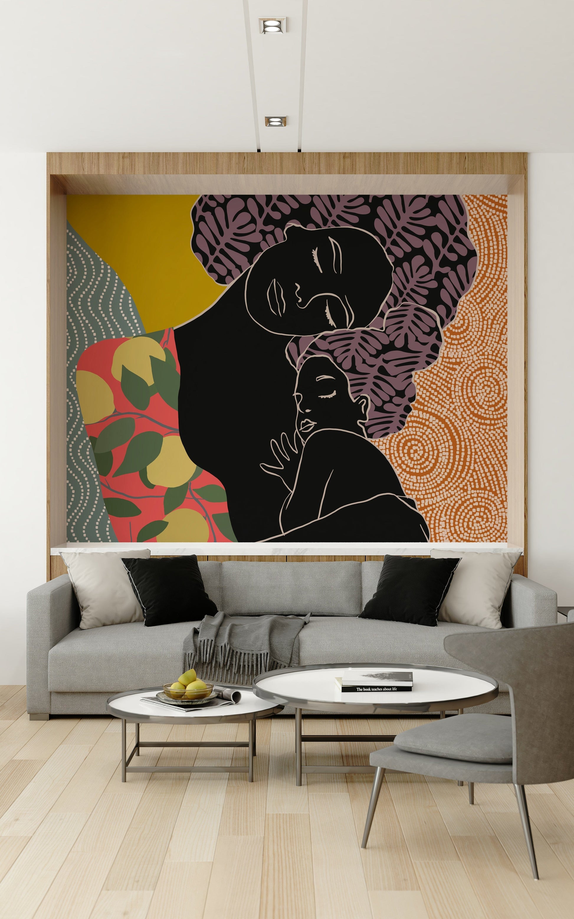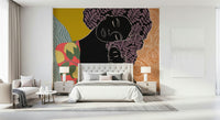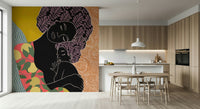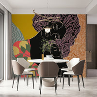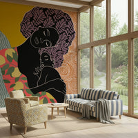 Bring the warmth of maternal love into your home with this unique wallpaper for walls. This stylized design features a mother and child in a comforting embrace, rendered in bold silhouettes and vibrant, earthy colours. The playful mix of patterns, from leafy motifs to swirling textures, adds depth and visual interest. The colour palette includes coral, mustard yellow, and muted greens, creating a space that feels both inviting and sophisticated. This wallpaper works well in nurseries, bedrooms, or living spaces, bringing a touch of artistic flair and heartfelt emotion to any room. This wallpaper creates a serene backdrop that enhances comfort and creativity.