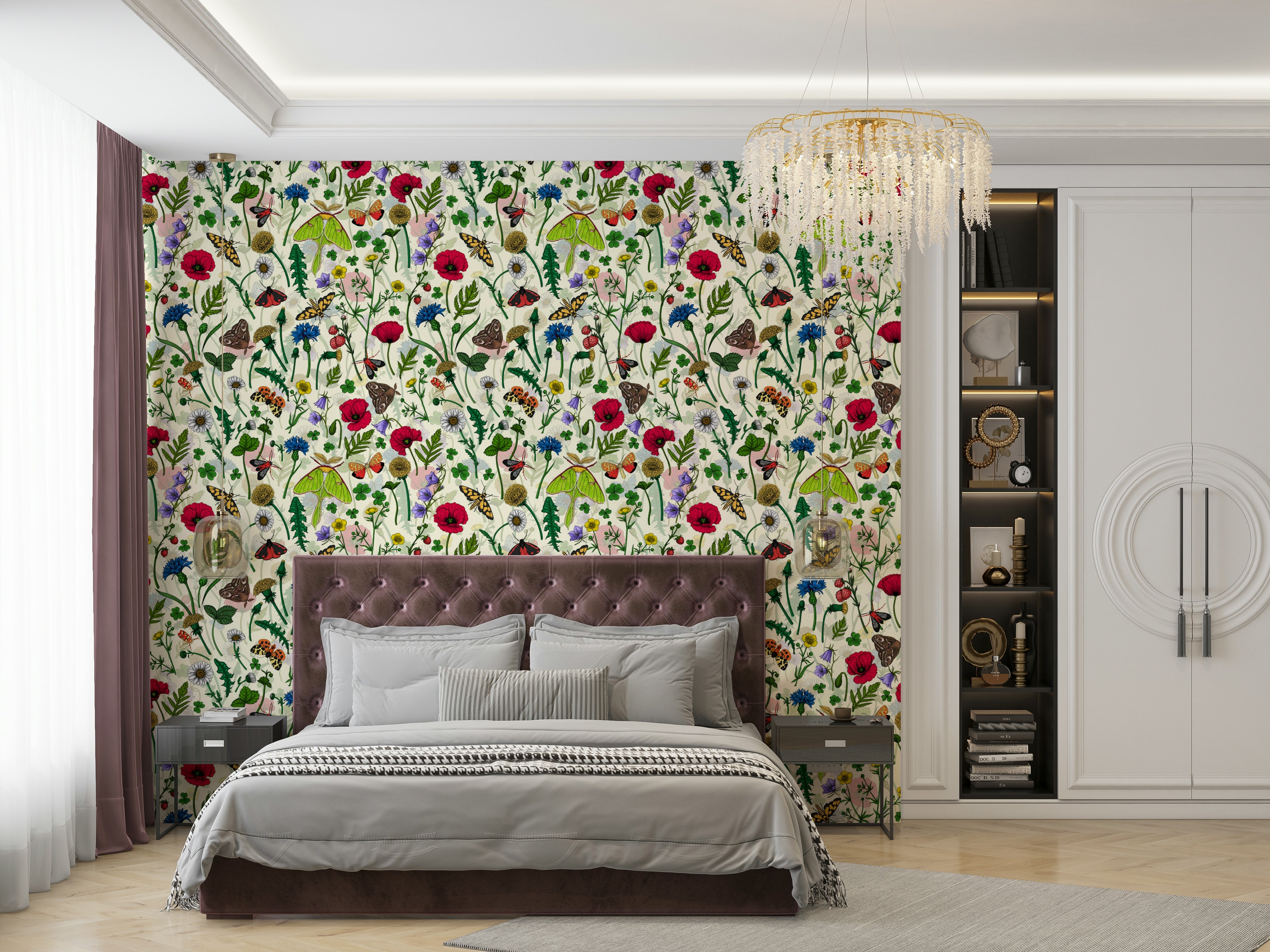 Moths and wildflowers wallpaper creating a tranquil atmosphere