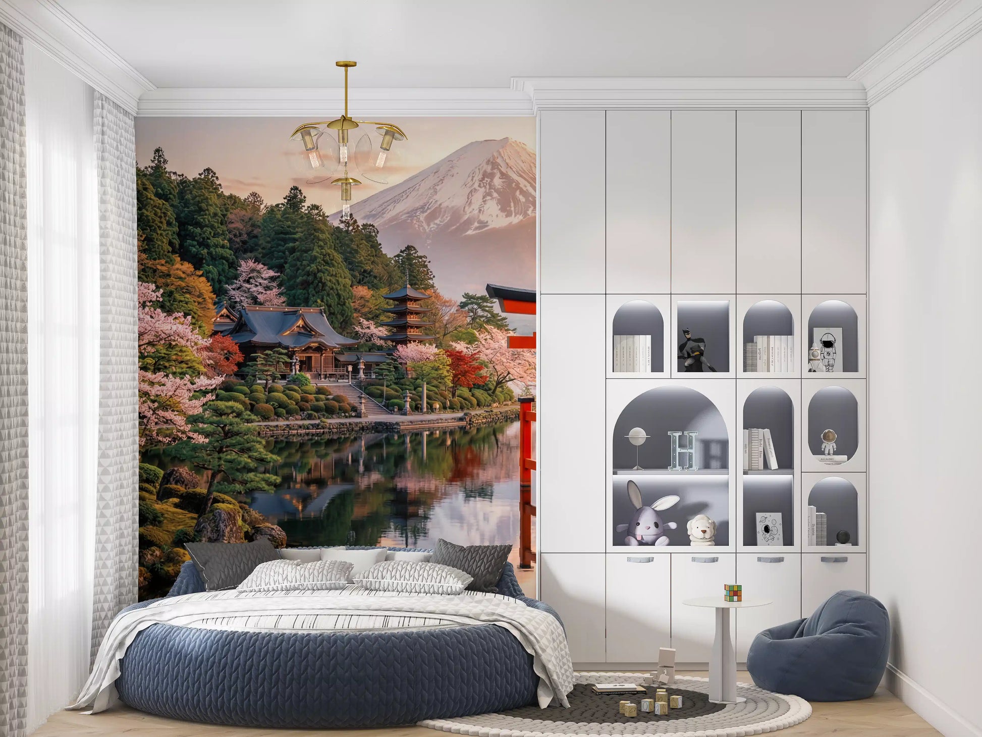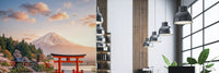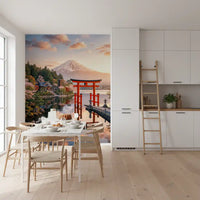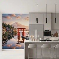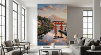 Transform your walls with this captivating scene of Mount Fuji reflected in tranquil waters. This wallpaper for walls brings the serene beauty of Japan into your home. The soft hues of dawn blend with the bold red of the traditional torii gate, creating a striking contrast. Lush trees and cherry blossoms frame the majestic mountain, adding depth and dimension. Ideal for a calming bedroom, a peaceful living room, or a sophisticated office. Elevate your interior with this scenic vista.