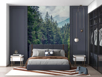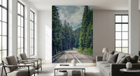 Transform your living spaces with this stunning nature-inspired wallpaper for walls. Showcasing a scenic mountain road framed by towering evergreen trees, it invites tranquility into your home. The cool green tones of the forest blend with the greys and blues of the sky and distant peaks, creating a serene and expansive feel. This design is perfect for living rooms, bedrooms, or hallways, adding a touch of the outdoors to any interior. It pairs well with rustic or modern décor, creating an immersive and peaceful environment. Let the beauty of nature enrich your personal sanctuary.