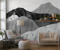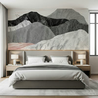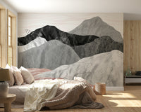 Transform your walls with this modern mountain vista. Neutral tones of grey marble, black rock, and blush accent give your space a tranquil feel. A flock of birds soars above the peak, adding a touch of life to this calming landscape. This wallpaper for walls brings a contemporary style to living rooms, bedrooms, or offices. The neutral palette effortlessly matches a variety of interior design styles, enhancing the room with a subtle yet refined elegance.