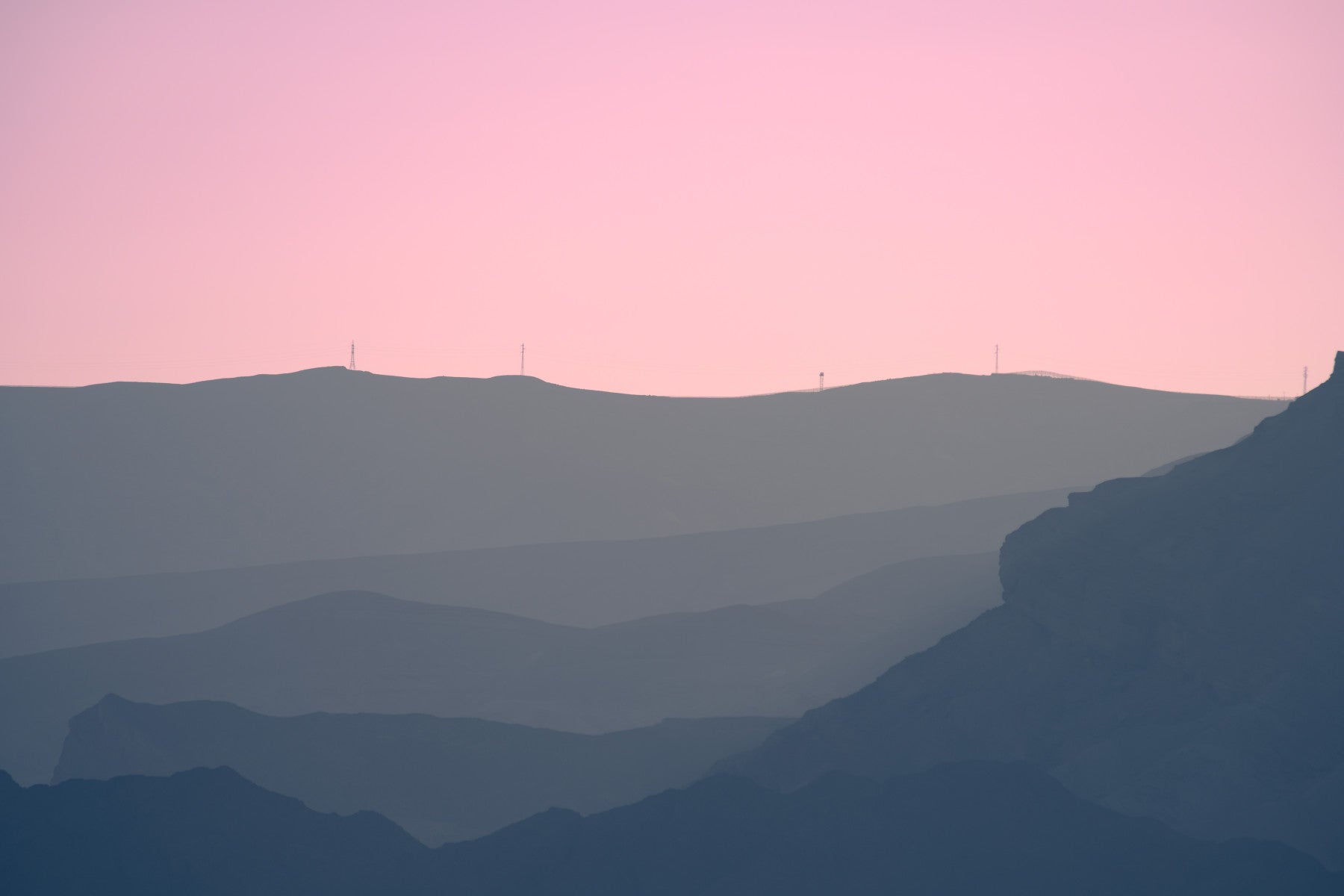 A beautiful, layered mountain landscape with a pink sunset sky.