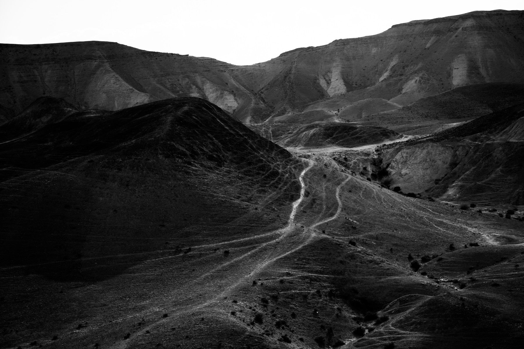 Immerse yourself in the stark beauty of the Judean Desert with 'Mountains of the Judean Desert 5'. This black and white wallpaper captures the raw, untamed spirit of this ancient landscape, revealing its rugged terrain and timeless allure. The image showcases a series of rolling hills, their surfaces etched with winding trails that speak of untold journeys. Shadows dance across the slopes, creating a dramatic contrast that emphasizes the starkness and grandeur of the scenery. Feel the stillness of the desert air and the weight of history as you gaze upon these mountains, a powerful symbol of resilience and endurance. The monochromatic palette accentuates the textures and forms, transforming your screen into a window onto this captivating wilderness. Perfect for those seeking a touch of minimalist elegance and a connection to the profound landscapes of the Middle East.