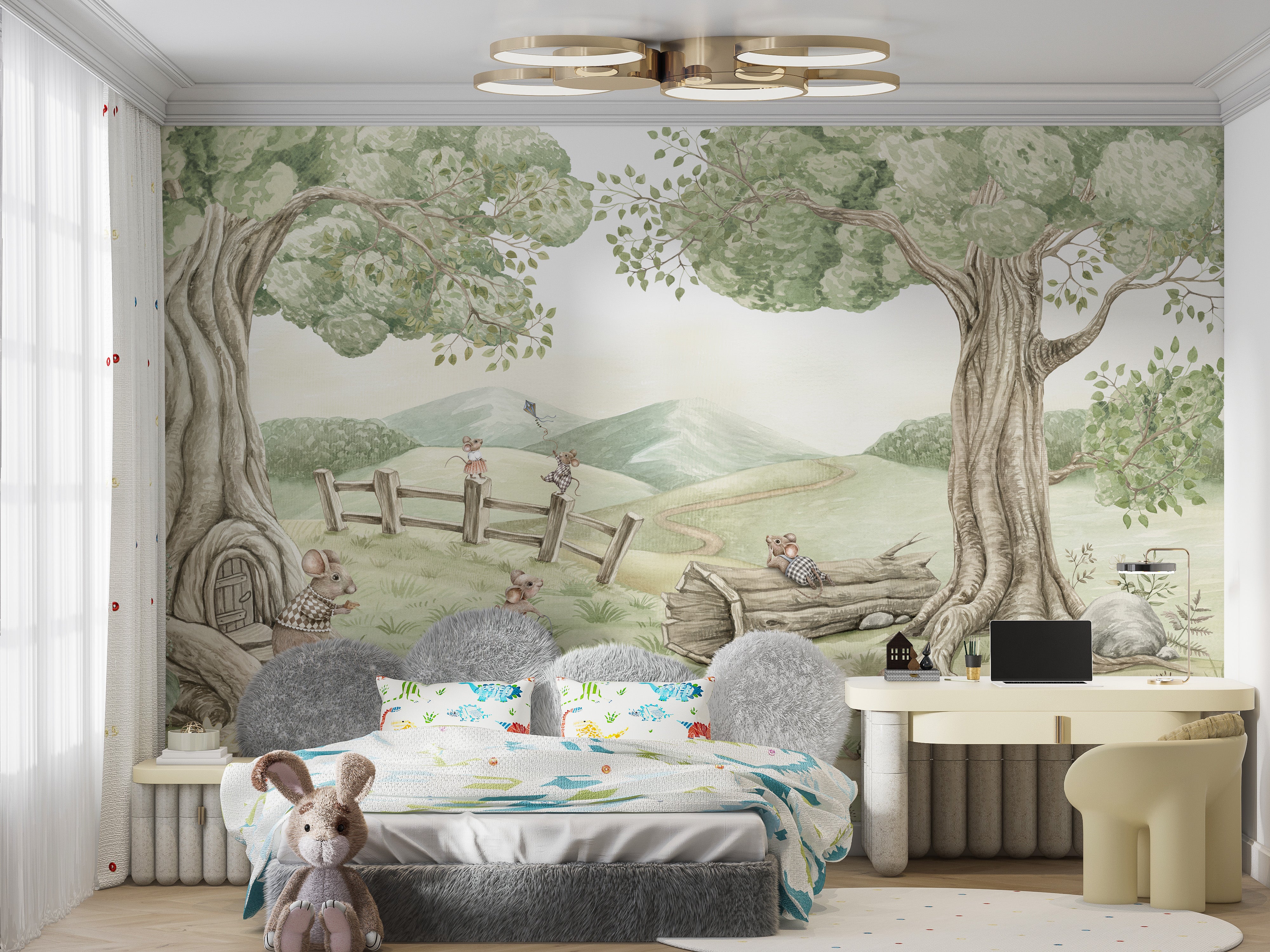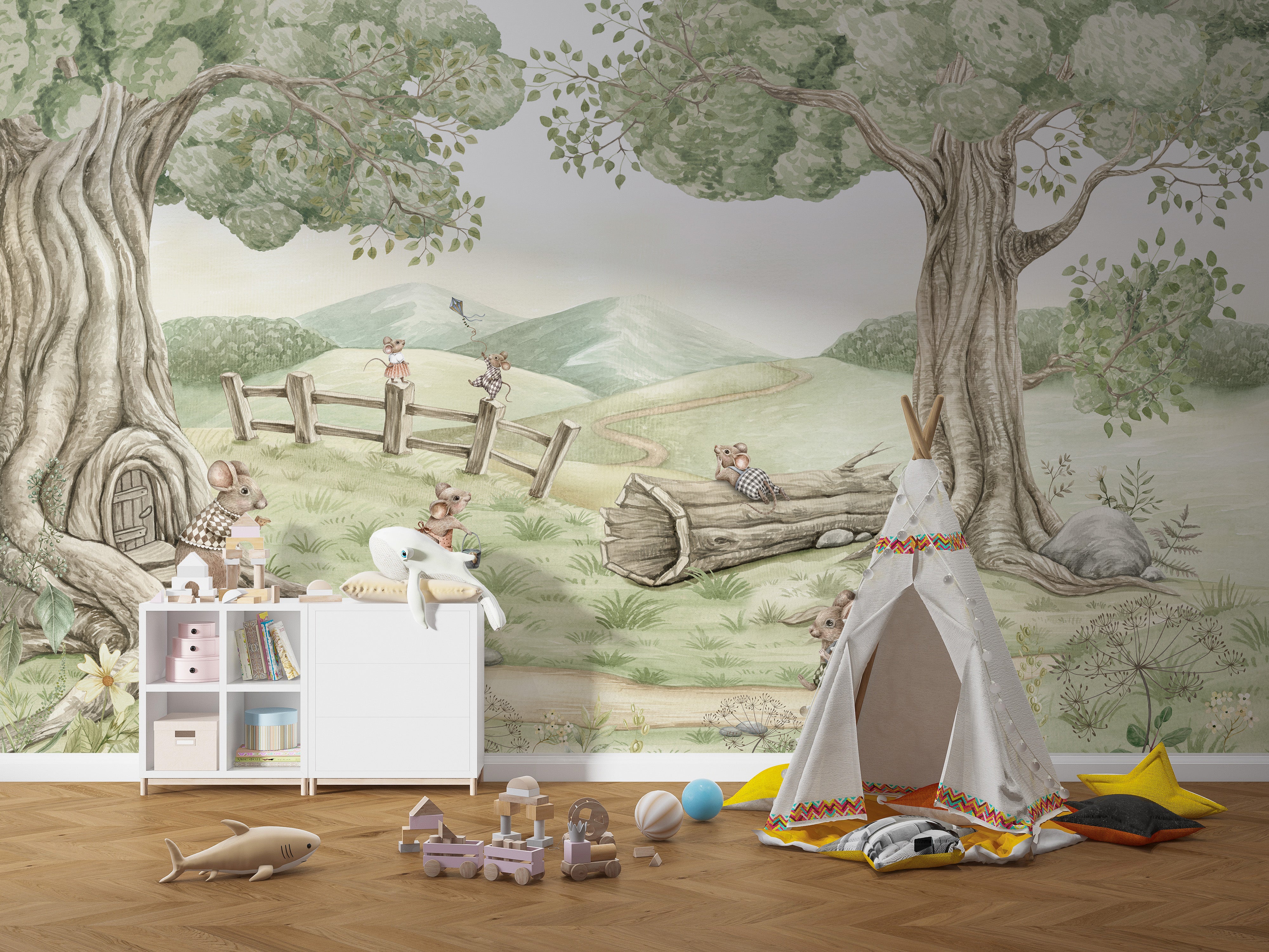 Looking to add a whimsical touch to your kids room? The Mouse family wall mural is the perfect kids room wallpaper to create a charming and playful atmosphere. This delightful mural features a cute mouse family enjoying a sunny day in the countryside. With detailed illustrations of mice playing, relaxing, and exploring, these murals spark imagination and joy. The soft colours and intricate design make it an excellent choice for a nursery or playroom. Secure this enchanting kids room wallpaper today and let your children enjoy a magical environment where stories come to life.