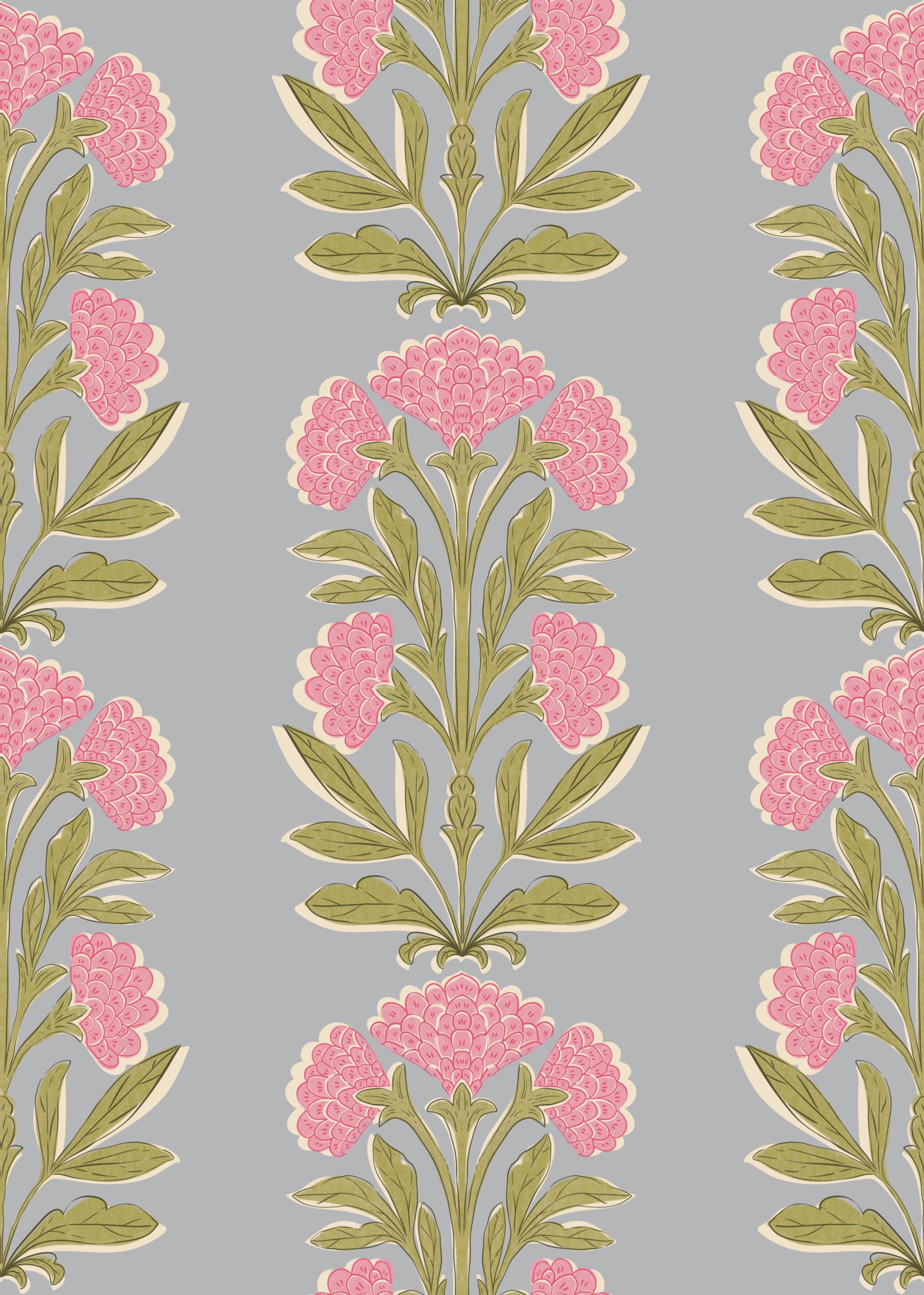 Bring sophistication to your space with this symmetrically designed floral wallpaper. It shows elegant pink blooms and olive-green foliage, set against a calming gray backdrop. This wallpaper for walls provides a refined, nature-inspired style, excellent for bedrooms, living rooms, or entryways. Its balanced design enhances interiors with a tranquil and inviting aura. Transform any room into a haven of serene beauty with this timeless design.