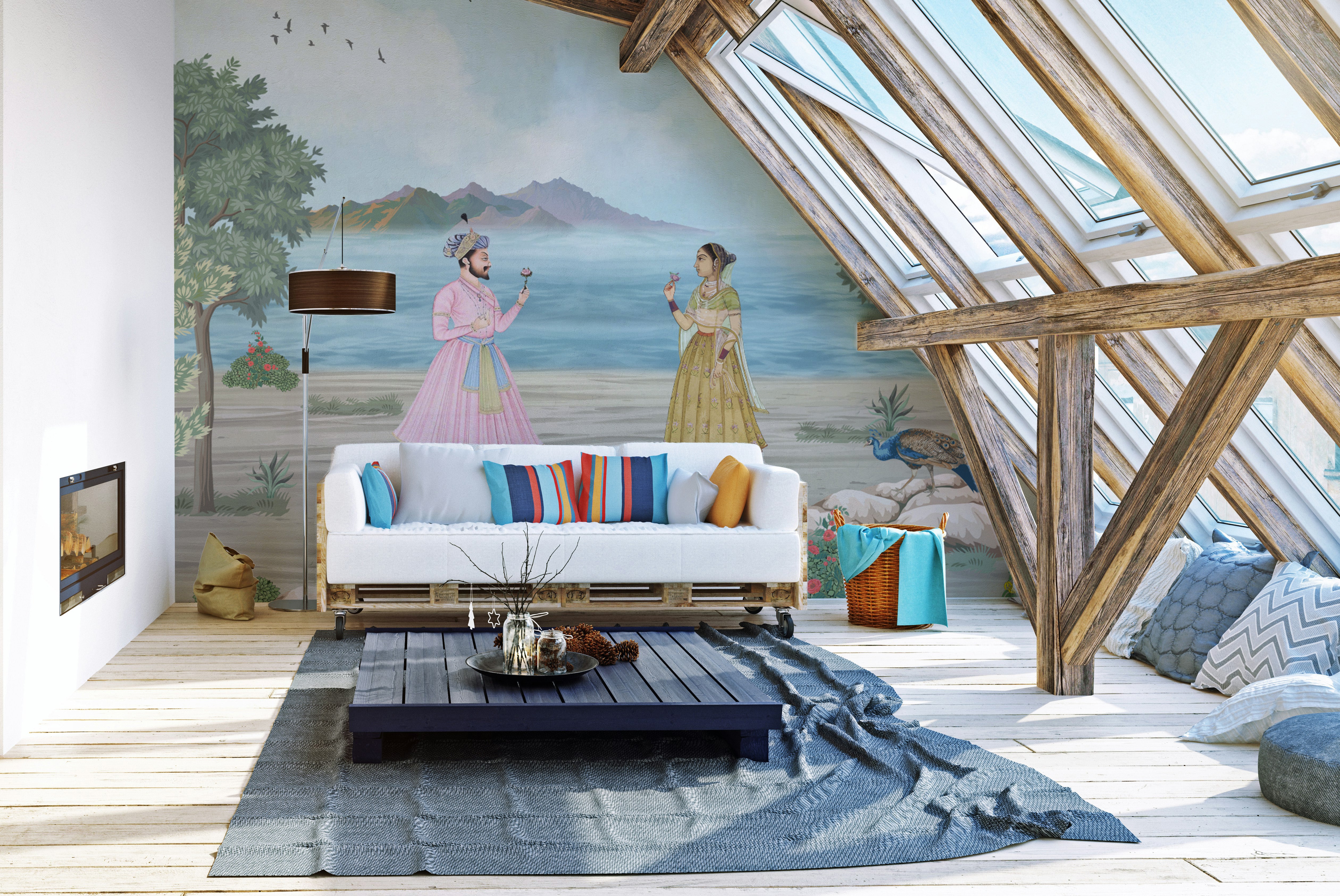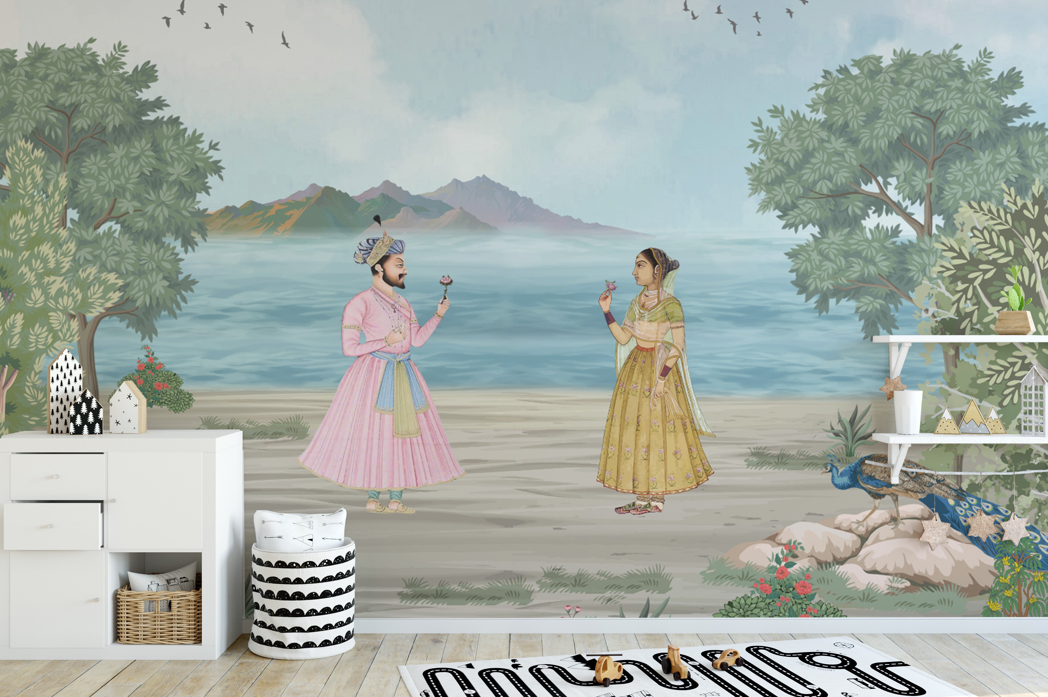 This mughal royal couple wall mural reflects the elegance of traditional mughal miniature art, featuring a regal pair exchanging flowers by a serene lake. The intricate details of royal attire, delicate flora, and a majestic peacock create a heritage-inspired setting. The scenic background with lush trees and distant mountains enhances the romantic and historical theme. Inspired by classic Persian art, this luxury palace-theme wallpaper blends well with traditional and contemporary interiors. The fine craftsmanship and rich color palette highlight the beauty of Mughal royalty, making it an excellent choice for spaces seeking a timeless heritage appeal.