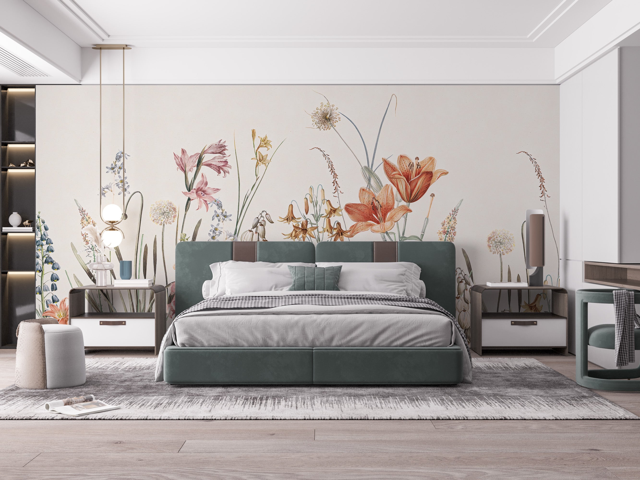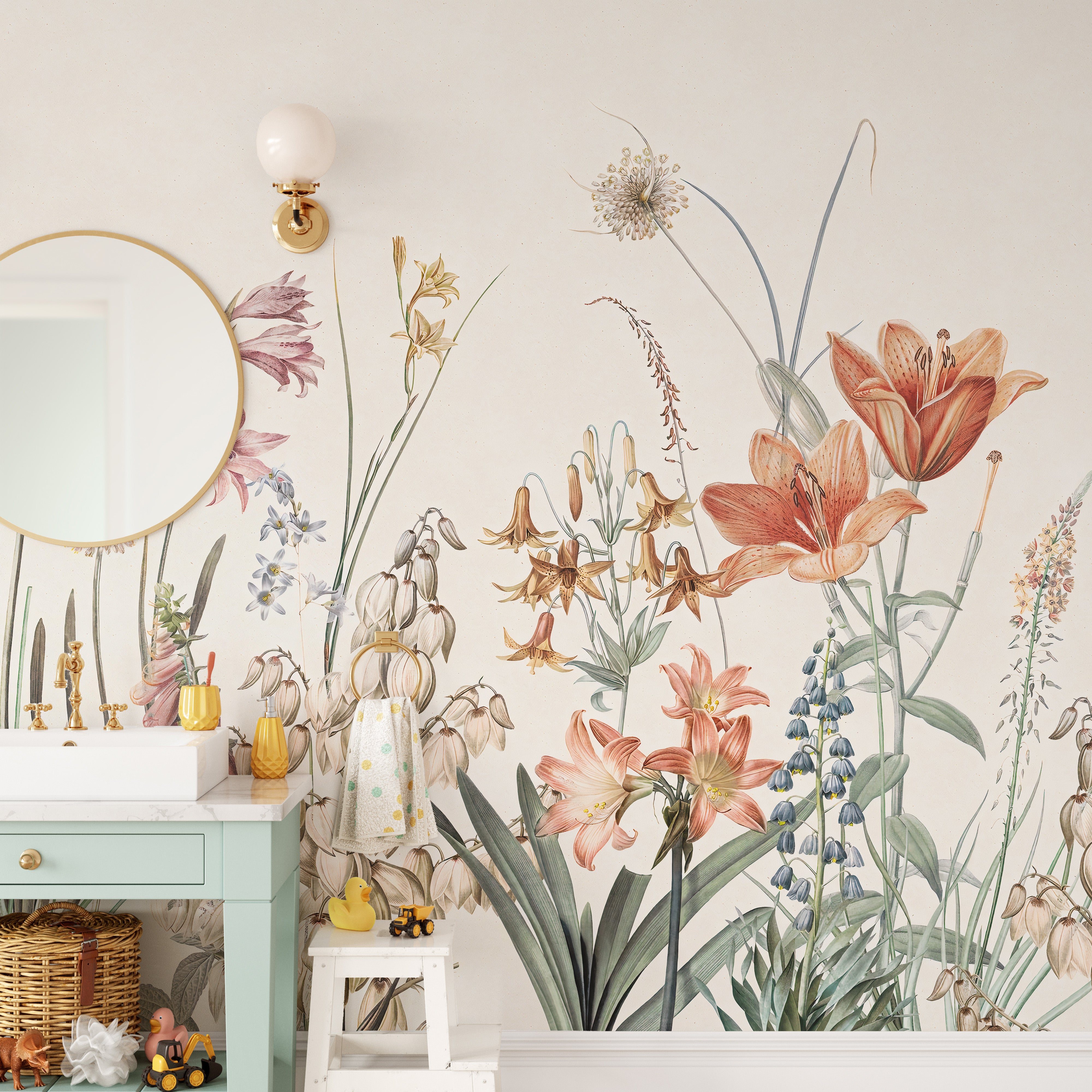 Scenic floral mural with hand-painted details