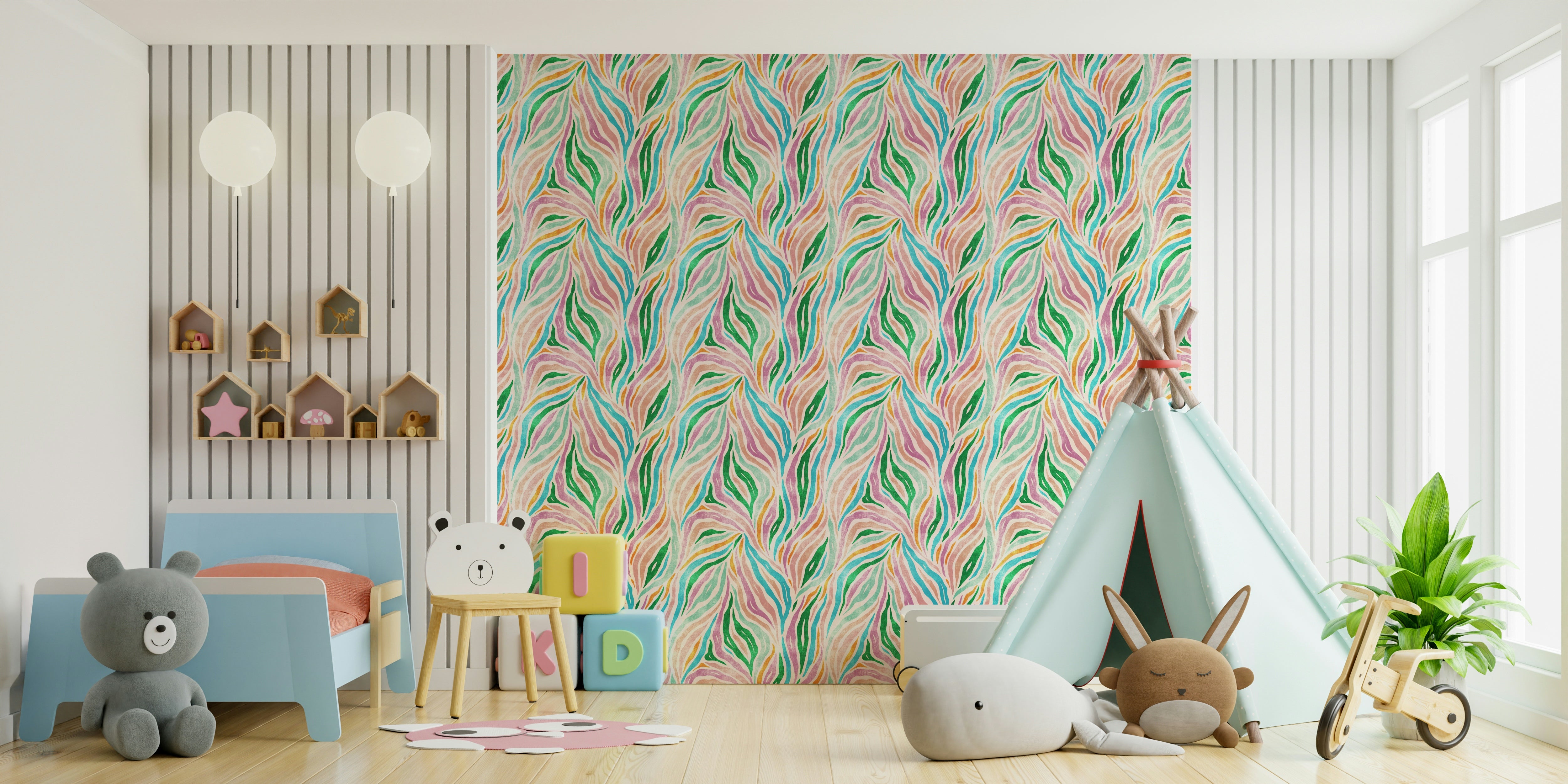 Embrace vibrant bohemian style with this captivating wallpaper. A playful twist on classic zebra stripes, this design features a kaleidoscope of pastel and jewel tones—think turquoise, emerald green, soft pinks, and warm oranges—all rendered in a textured, hand-painted style. The subtly distressed background adds depth and a touch of vintage charm, perfectly complementing the flowing, organic lines of the multicolored zebra pattern. This wallpaper evokes a feeling of carefree energy and effortless chic, ideal for adding a pop of personality to any space. It's a unique blend of wild animal print and laid-back boho aesthetic, offering a fresh and modern take on a timeless pattern.