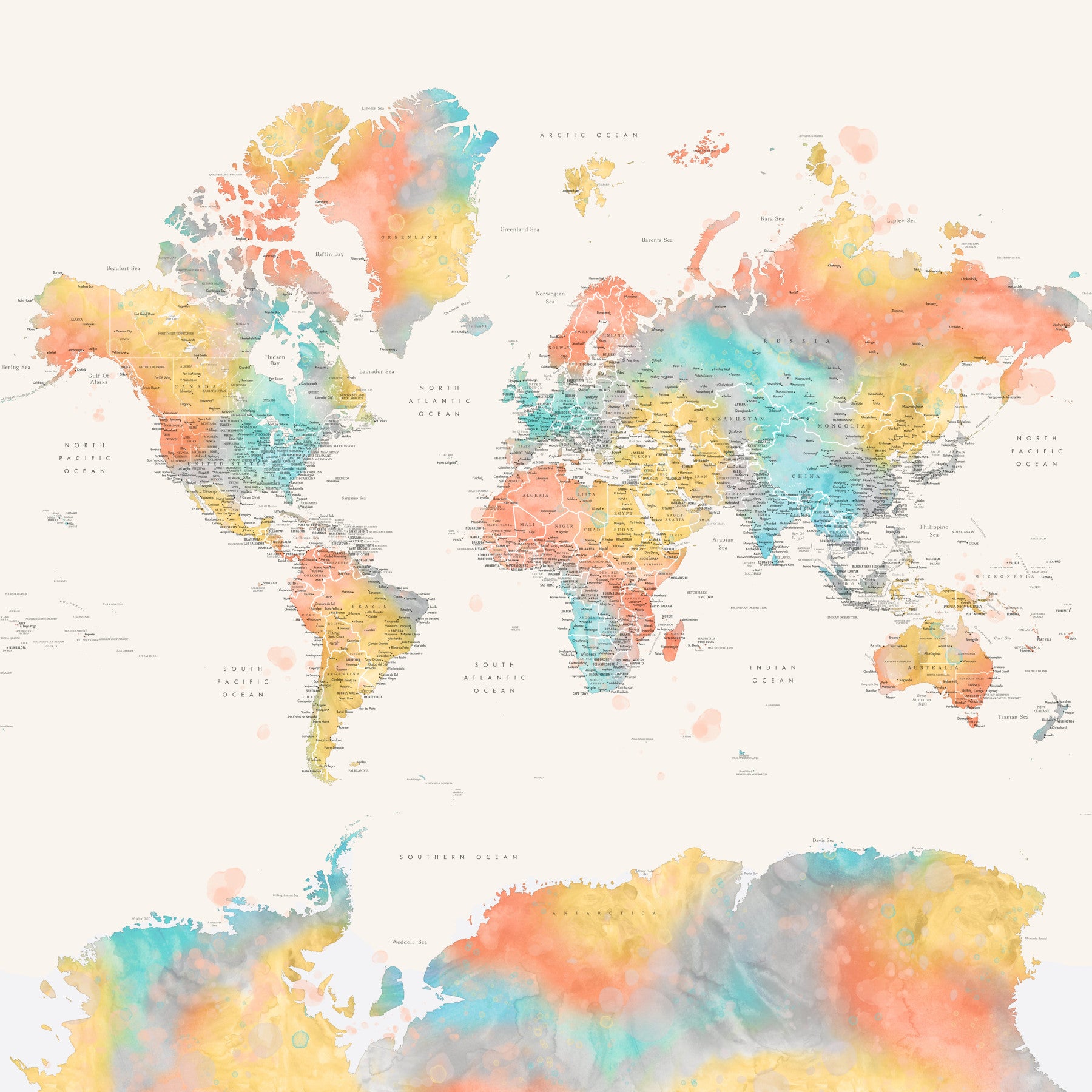 Multicolor watercolor world map wallpaper for kids’ rooms