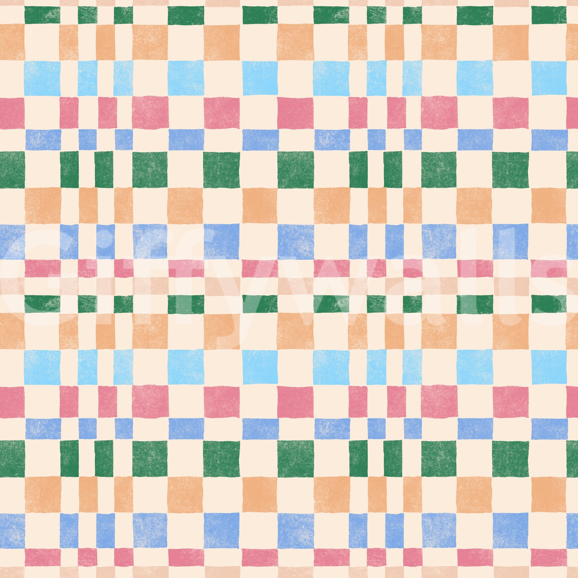 Dive into a vibrant 'Multicolored Funky Woven Check Jewel Jungle' with this captivating wallpaper. A playful array of pastel peach, dusty rose, sky blue, and forest green squares create a textured check pattern reminiscent of woven fabric. The slightly rough, hand-painted effect adds a charming, artisanal feel, evoking a sense of whimsical handcrafted beauty. This design perfectly blends a retro check aesthetic with a contemporary, earthy palette, making it ideal for adding a touch of fun and vibrancy to any digital device.