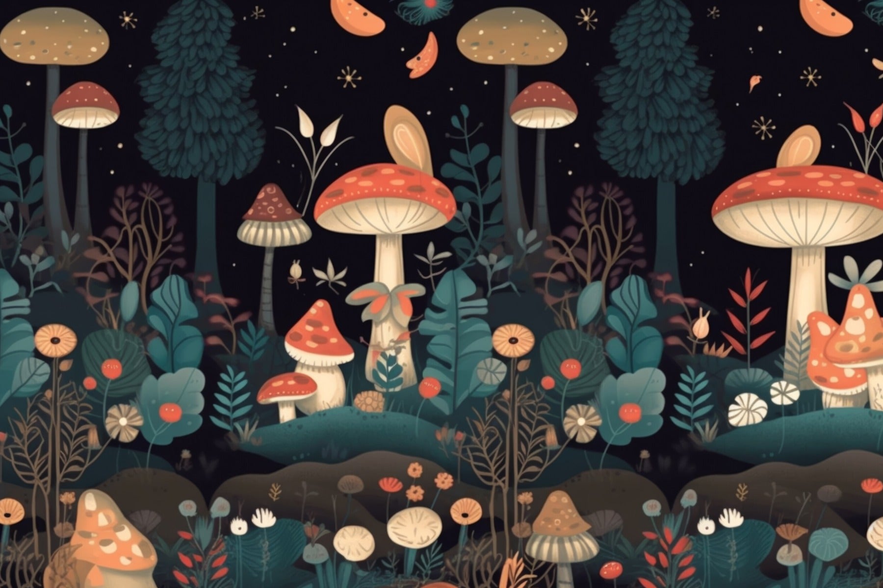 Discover the charm of a mushroom garden wallpaper mural, a captivating addition to your hallway that ushers in an element of magical allure. As you meander through your home, this mural unfurls a vibrant tableau of nocturnal grace, with rich hues that capture the imagination. Each mushroom stands as a sentinel of wonder amidst a tapestry of flora, creating a visual narrative that enchants and inspires. Perfect for adding a touch of enchantment to your daily passage, this wallpaper offers an escape to a mystical grove, right within your walls. Crafted with attention to detail, the mural's artistry turns your corridor into a gallery of natural beauty, brimming with storybook charm.