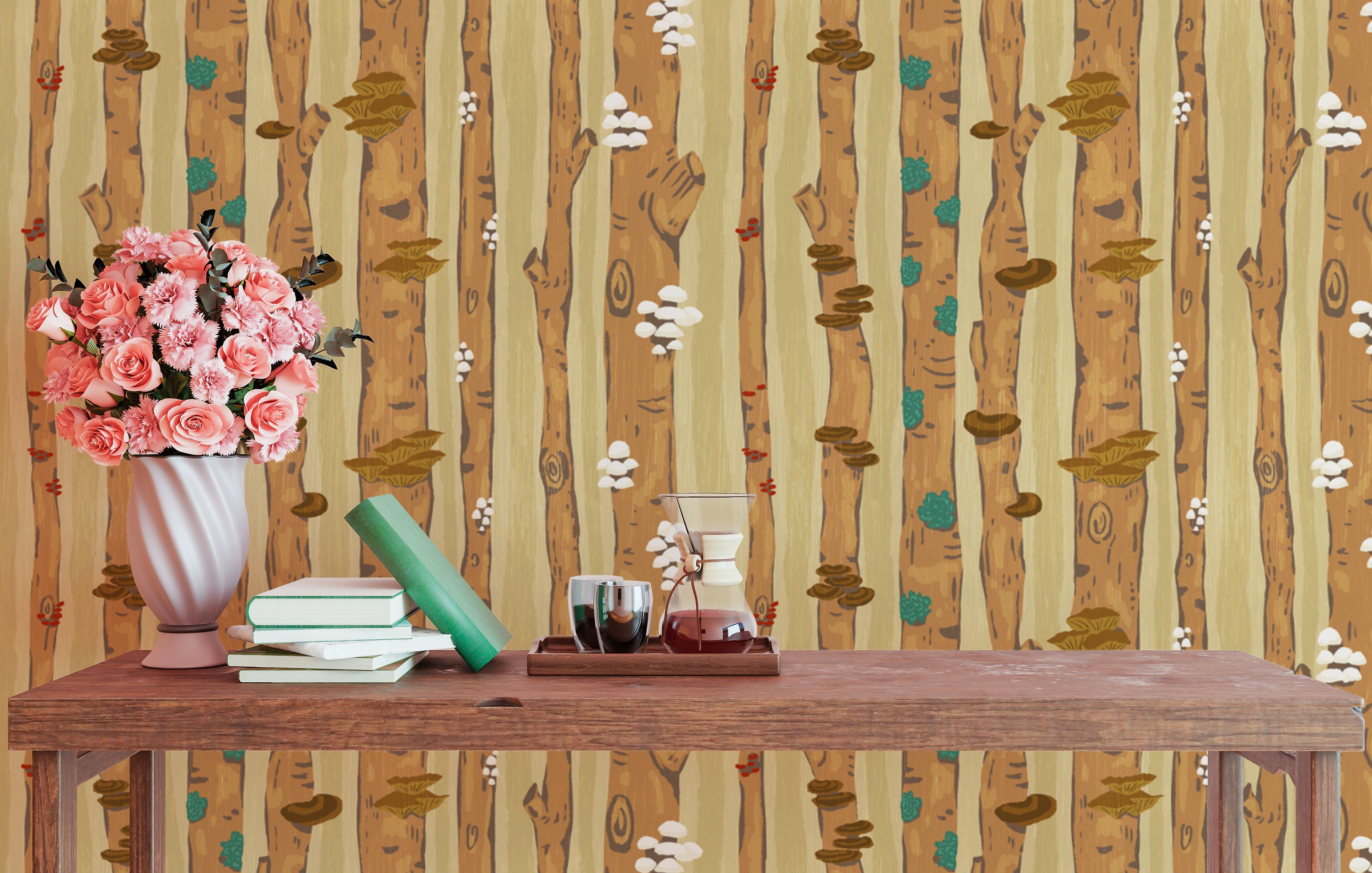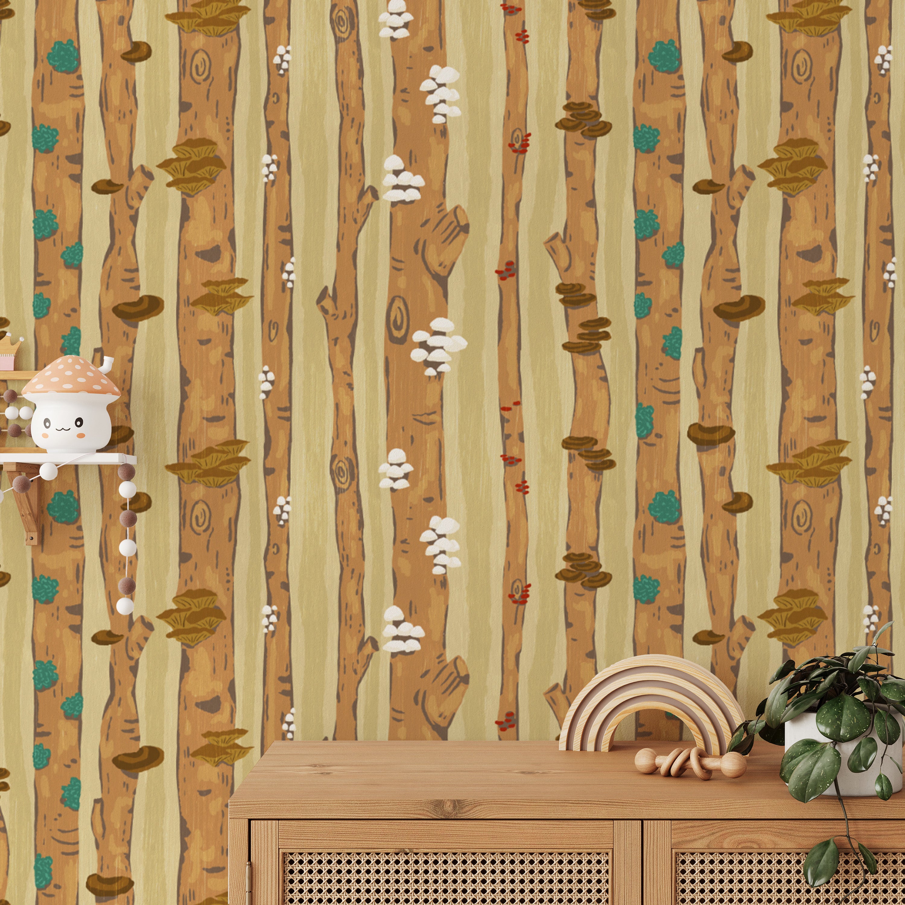 Bold mushrooms on tree trunks wallpaper for a striking wall accent.