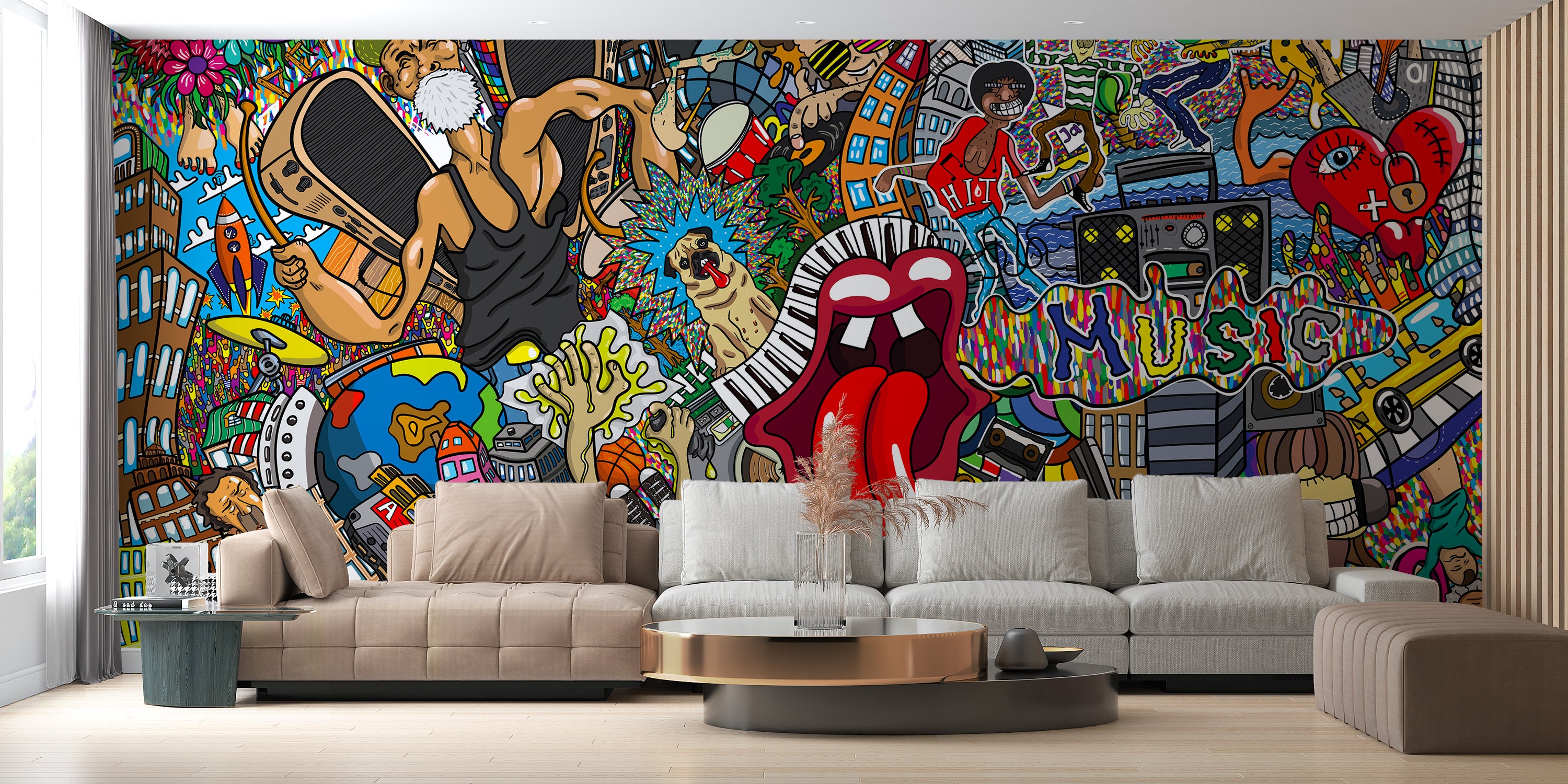 Switch into a symphony of style with the electric music collage graffiti wall mural. This artistic wallpaper is a harmonious composition of vibrant colors, musical elements, and graffiti art, creating a visual melody that resonates with creativity and rhythm. Perfect for music lovers and art enthusiasts alike, this mural embodies the energy of a live concert with the edginess of street art. It’s an expressive celebration of sound and vision, designed to inspire and energize any room. Whether it’s for a studio, bedroom, or entertainment area, this mural adds a unique, dynamic vibe to your walls, hitting all the right notes in interior design.