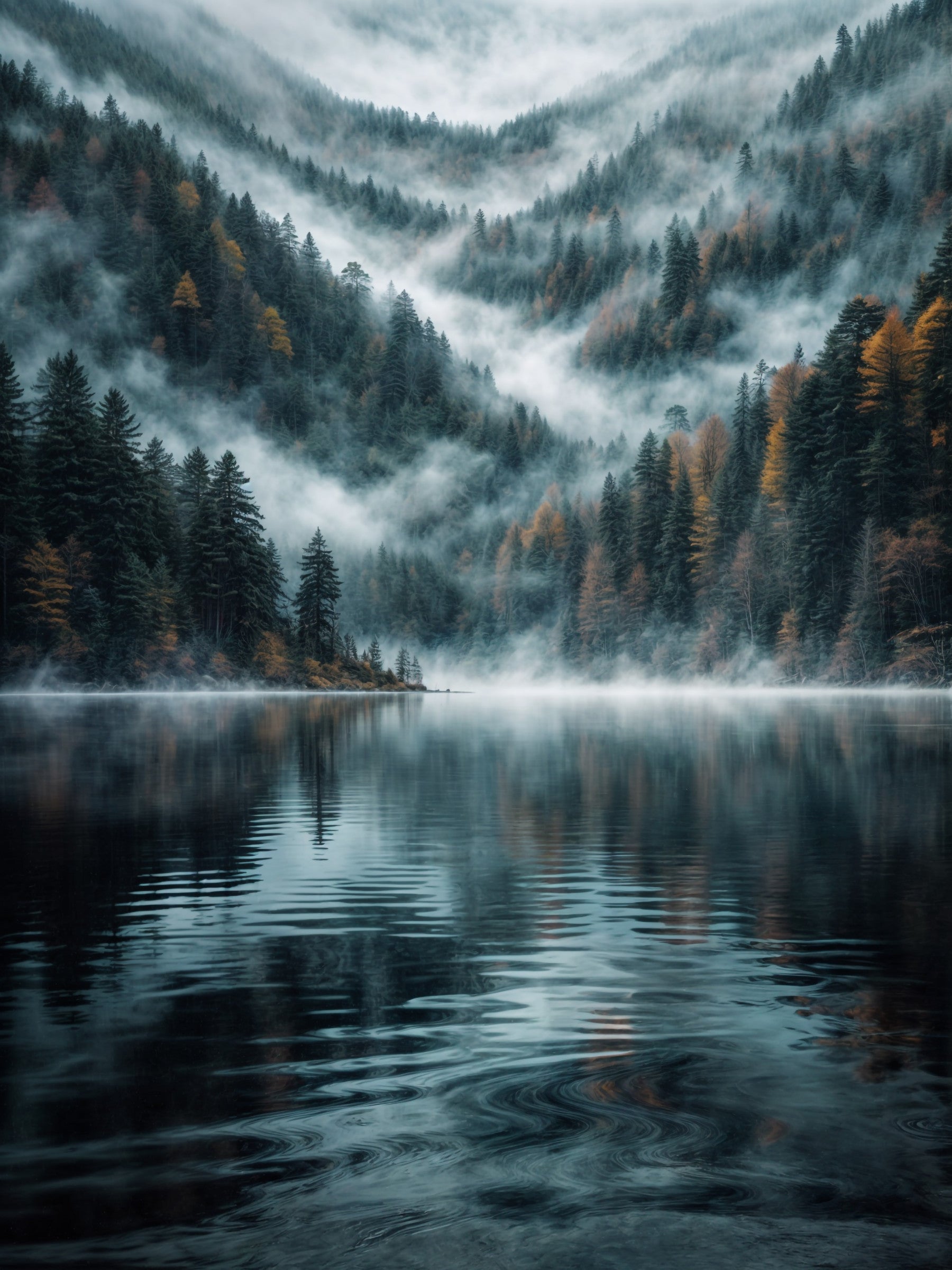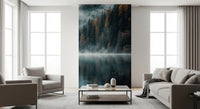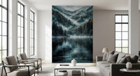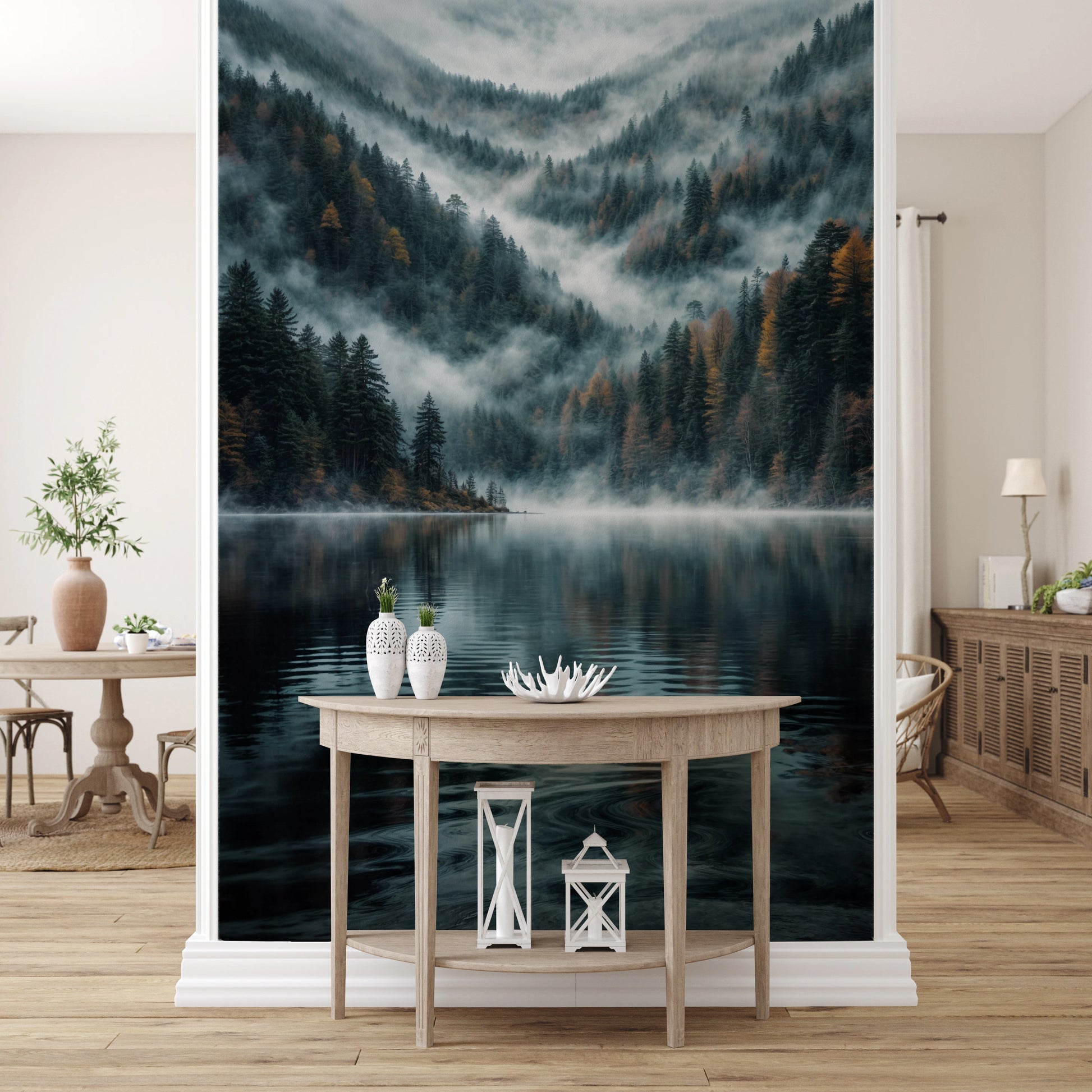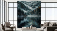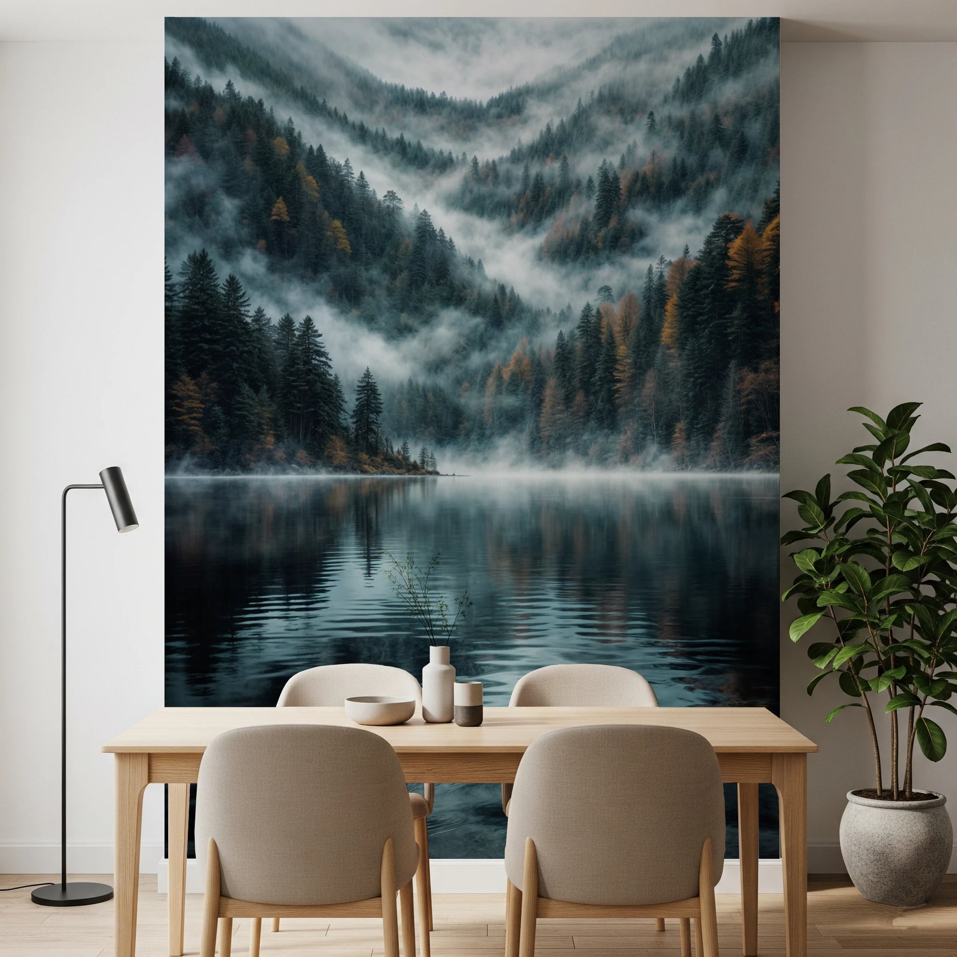 Transform your walls with the serene beauty of this landscape. The image captures a tranquil lake reflecting the mist-shrouded forests, blending deep blues and greens with soft gold accents. Ideal for adding a calming touch to any bedroom, living room, or office space, this wallpaper for walls creates an atmosphere of peace and contemplation. Its intricate details and balanced colour palette enhance interior design. The natural scenery brings the outdoors inside, making any room feel more open and inviting. Enjoy the beauty of nature without leaving your home.