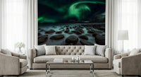 Invite the magic of the Aurora into your home. This landscape captures the glowing green lights dancing above a serene beach with a stone shoreline. It features snow-covered mountains, adding to its tranquil appeal. This nature-inspired wallpaper for walls is an ideal choice for a study, living room, or bedroom where you want to foster a feeling of calm and natural beauty. Its dark and light play complements any decor.