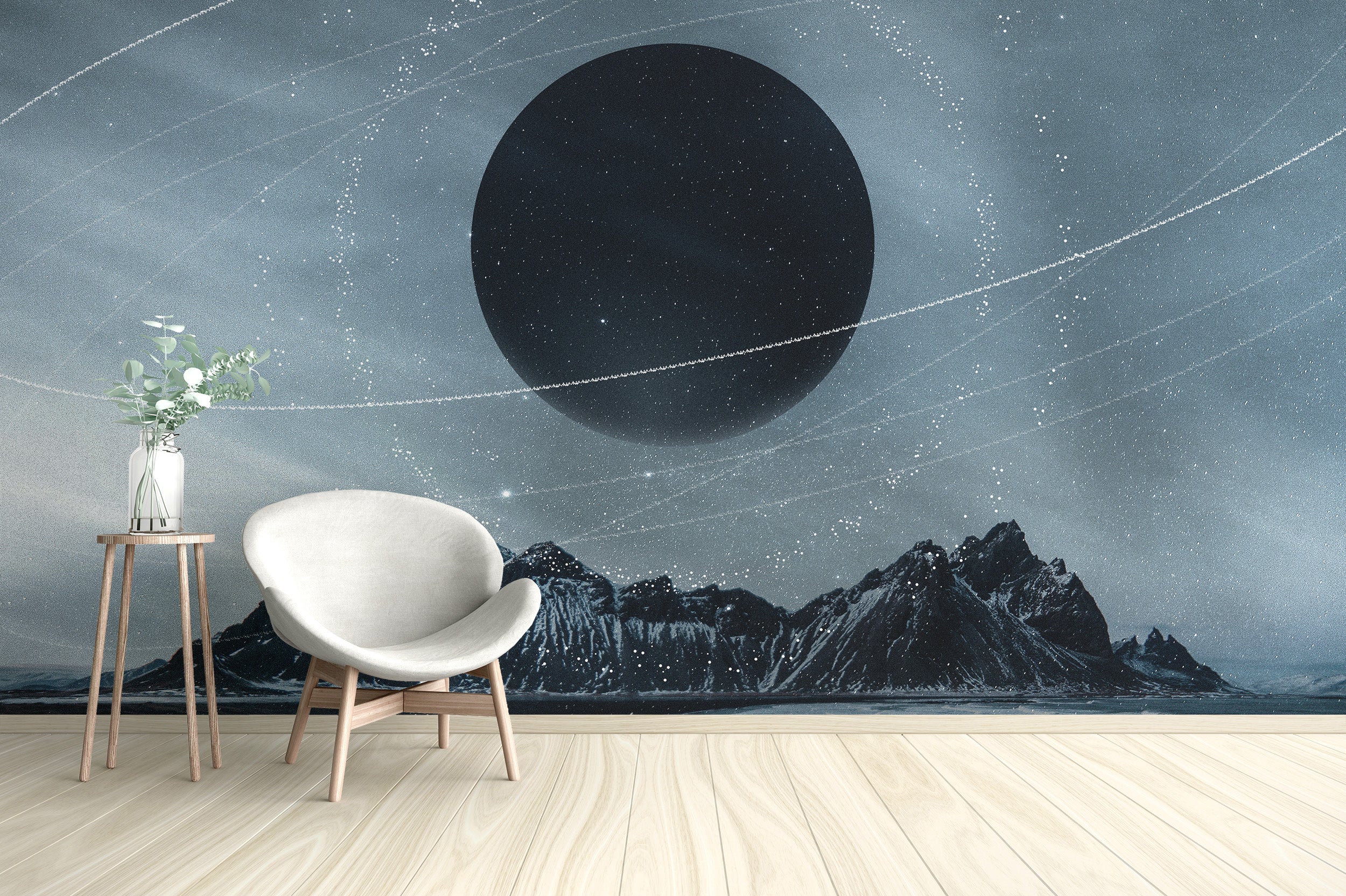 Transform your space with the mystical cosmic black hole wallpaper, a breathtaking fusion of galaxy aesthetic wallpaper and dark space background. This mesmerizing design features a colossal black hole surrounded by starry cosmic elements set against a dramatic mountain landscape. Perfect for creating a futuristic landscape art vibe in bedrooms, offices, or gaming rooms. The celestial fantasy landscape adds a surreal, dreamlike ambience, making it a must-have for space lovers. Elevate your interiors with this outer space surrealism masterpiece. Crafted for easy application, this sci-fi space wallpaper turns any wall into an interstellar escape. Shop now and explore infinity!