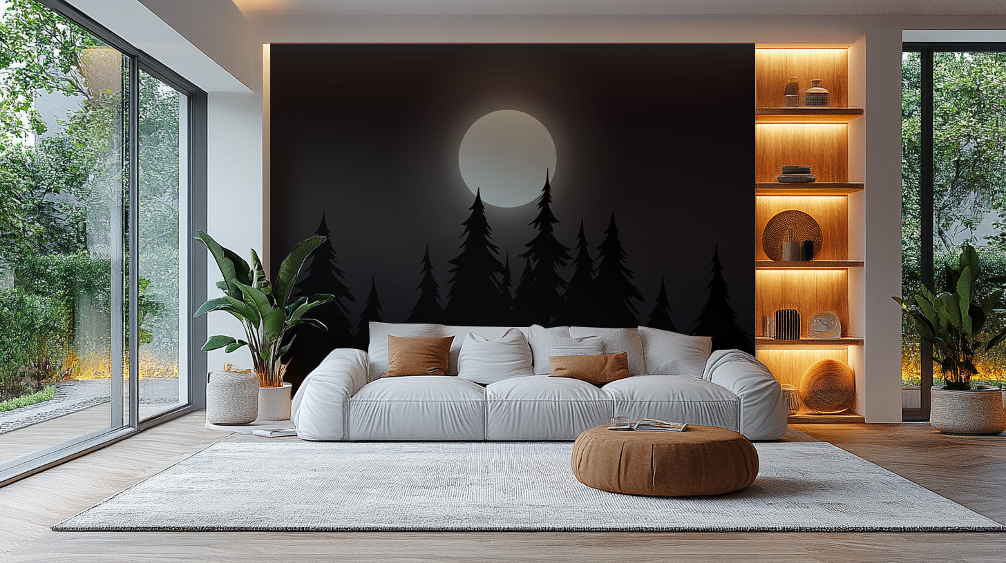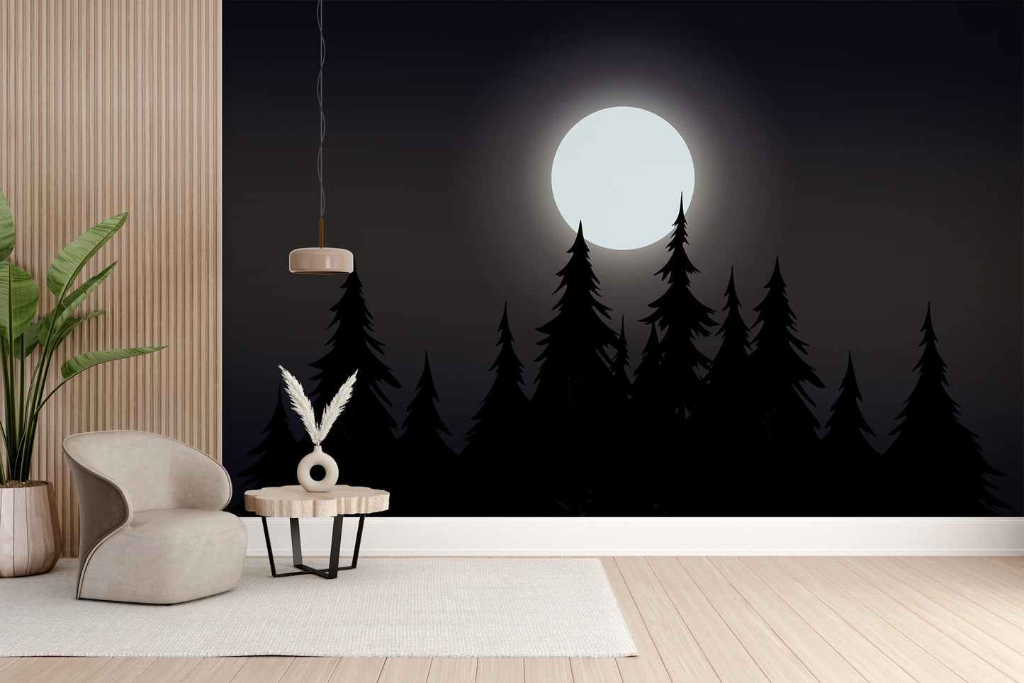Create a captivating atmosphere with this mystical moonlit forest wallpaper. The glowing full moon casts a soft light over the dark silhouette of towering pine trees, bringing a serene yet mysterious vibe to any setting. The deep tones of the night sky forest wallpaper add depth and character, perfect for bedrooms, living spaces, or creative workspaces. This dark aesthetic moon wallpaper enhances the beauty of nature with its rich details and shadowy allure. Ideal for those who appreciate the charm of a midnight forest silhouette wallpaper, this design offers a timeless appeal with a touch of magic.