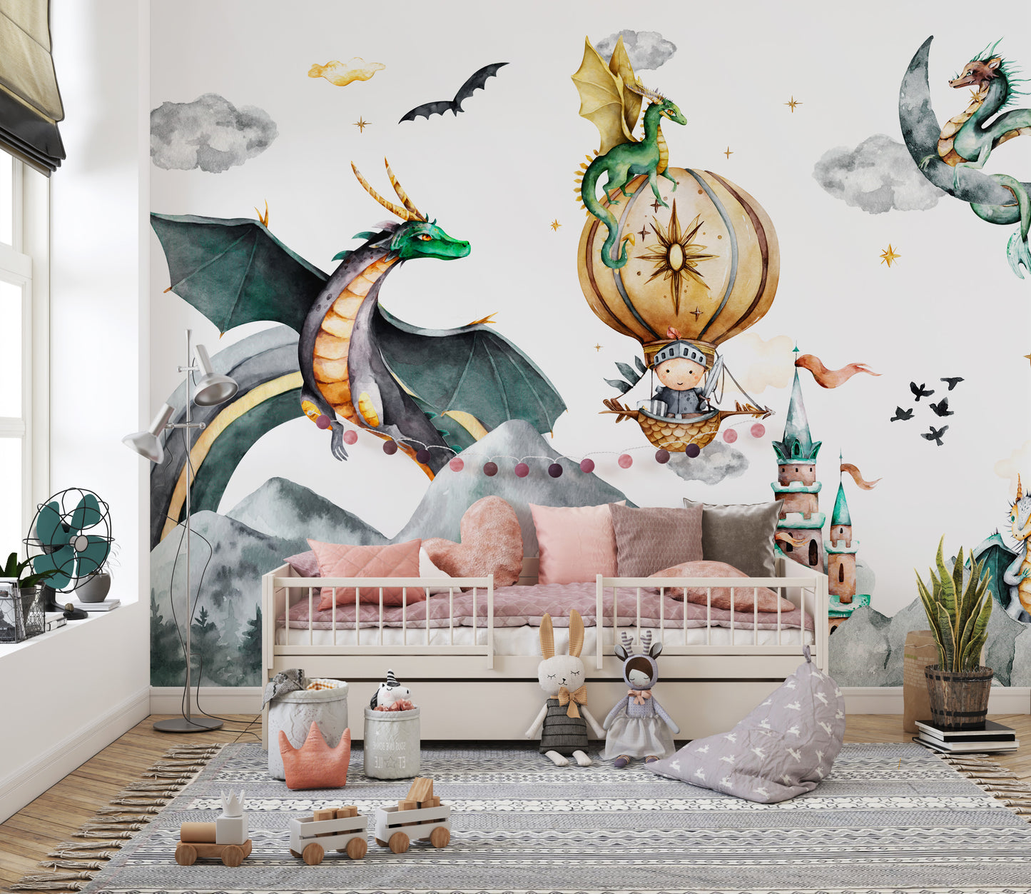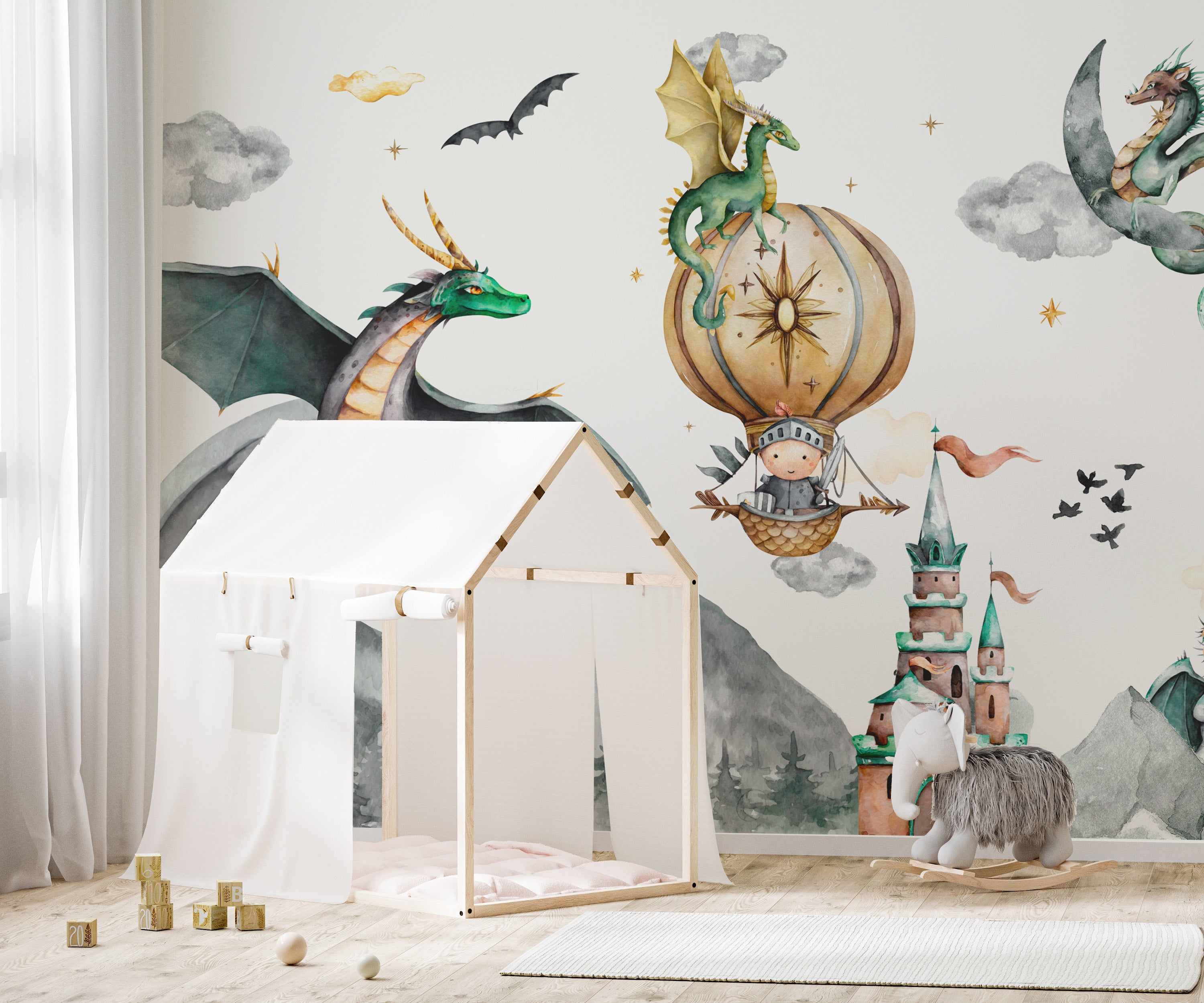 The mystical mountain dragon wallpaper sweeps across the walls with an air of adventure and legend. It's an ideal playroom wallpaper that sets the stage for epic tales and courageous quests. Vibrant with the greens of mythical peaks and the bold silhouettes of dragons, this design stirs the imagination of any young knight or aspiring sorcerer. Above the mountains, winged protectors of treasure and realm glide, sparking stories of valor and fantasy. In the midst of this enchanted scenery, a young adventurer in a hot air balloon signifies the beginning of a fantastical journey. The playful nature of the design makes it a fitting backdrop for a space dedicated to creativity, fun, and play. Here, every day brings a new chapter of an ongoing saga where children can dream and play amidst the guardians of a bygone, magical world.