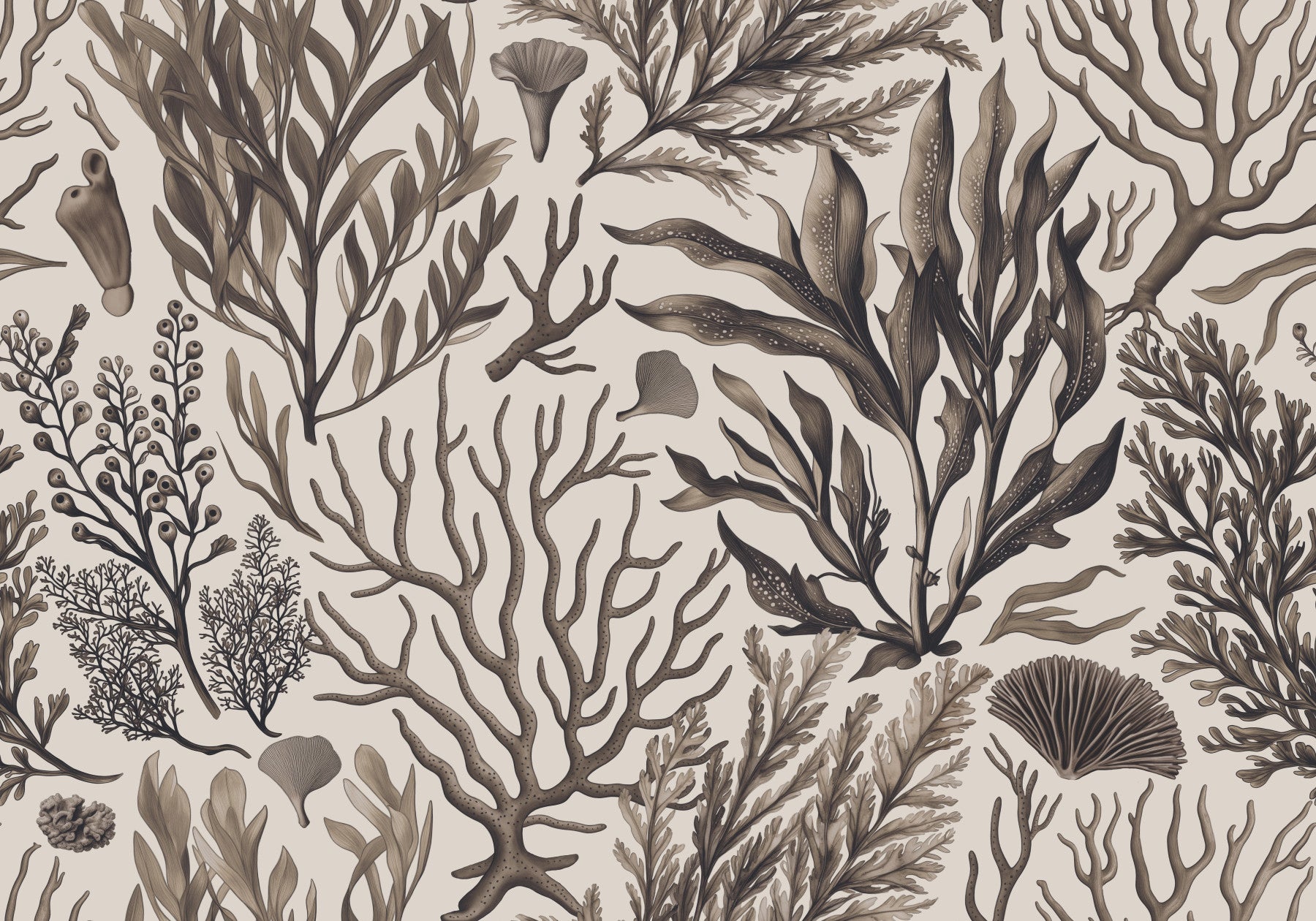 Immerse yourself in the serene allure of a fantastic underwater world with algae, seaweed, gorgonians and corals in the style of vintage lithographs. This design captures the essence of marine life, offering a peaceful escape into the beauty of nature. Perfect for creating a calming atmosphere in bedrooms, bathrooms, or a private spa, but it makes also a great statement wall in an office, restaurant or hotelroom. This wallpaper invites you to daydream under the sea's enchanting embrace. Transform your space with this captivating ocean-inspired pattern that's sure to spark imagination and wonder.