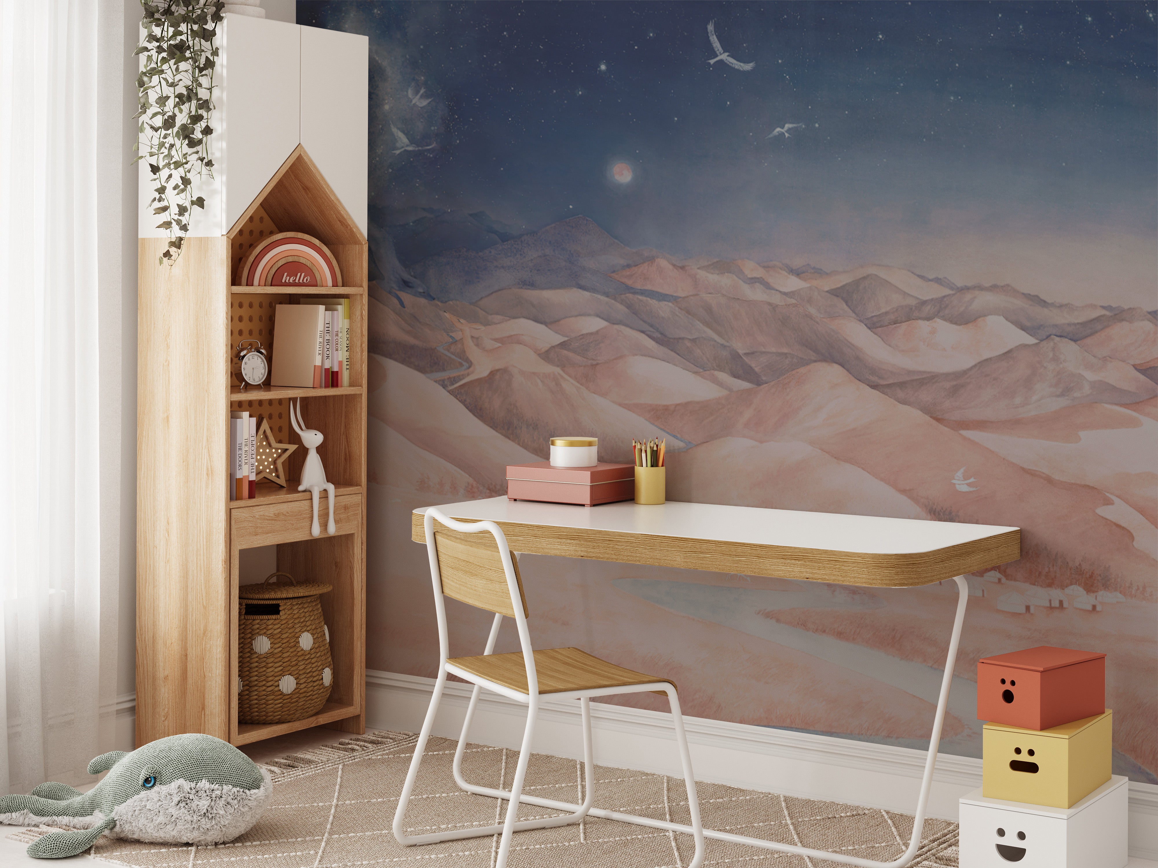 Give your room an instant makeover with Mystical Starry Night Landscape Wallpaper, a stunning print that interweaves ethereal landscape wallpaper with the starry night sky artwork. This magical mural contains, undulating in watercolor, rolling representations of mountains and a river, with a sky full of stars, all of which evoke tranquillity and amazement. The fantasy night sky background wallpaper creates a wonderful, mystical atmosphere suitable for bedrooms, living rooms, and meditation areas. With soft pastel landscape colors, this mural adds serenity to the interior. Enhance your decor with this beautiful scenic mountain mural and let the wonder of the outdoors grace your home interior. Experience tranquility with this whimsical nature illustration today!