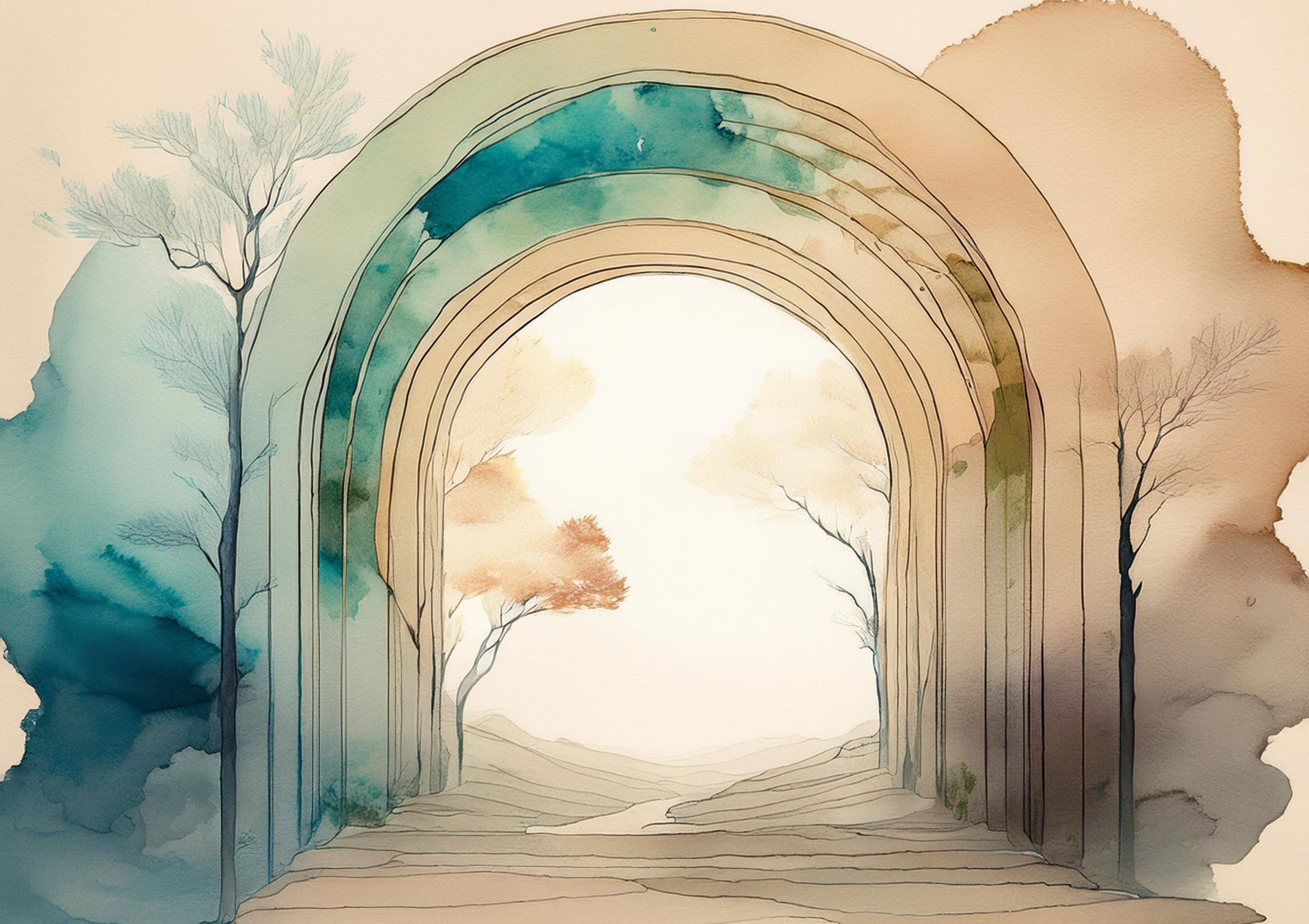 Immerse yourself in the ethereal beauty of this abstract watercolor wallpaper. The design features a mesmerizing series of interconnected arches rendered in soft, flowing watercolor tones of teal, beige, and earthy browns. These arches frame a distant, minimalist landscape, creating a sense of depth and mystery. The subtle color palette and flowing lines promote a feeling of tranquility and introspection. It’s the perfect choice for those seeking a sophisticated yet calming aesthetic for their living space.