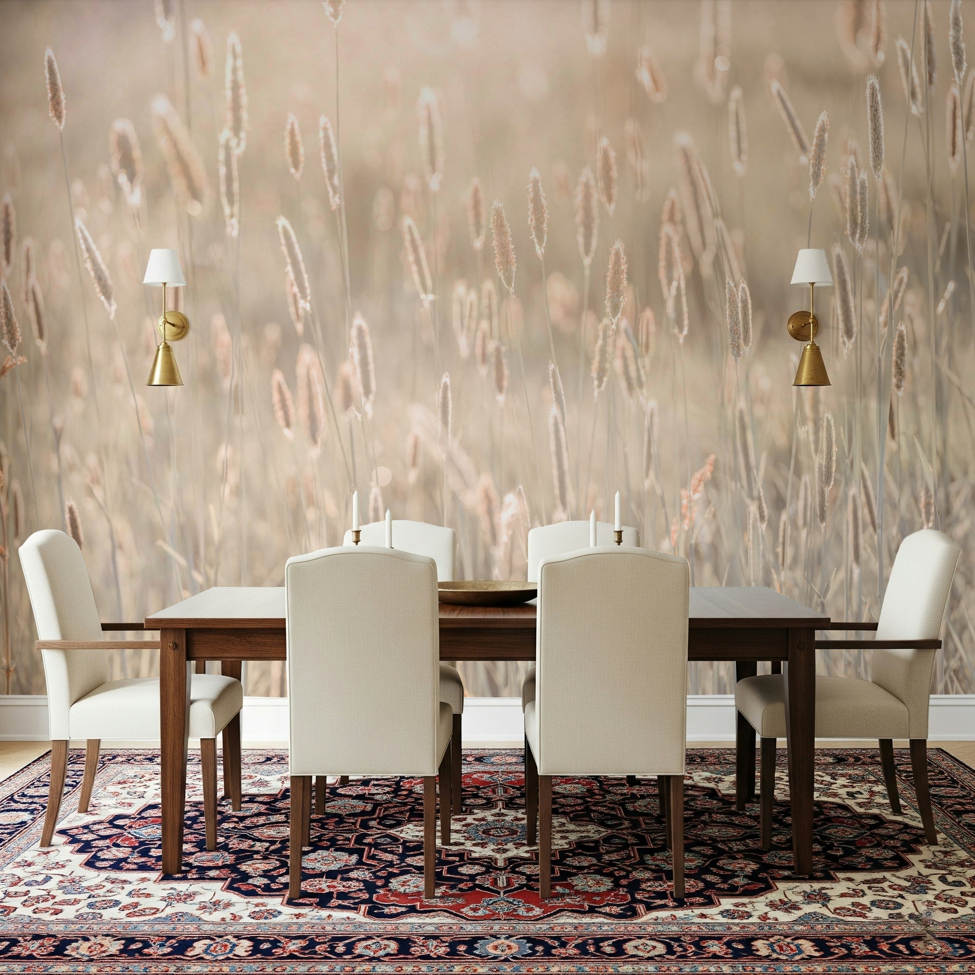 Summer meadow. Transform your space into a sun-drenched meadow with this delicate wallpaper. Featuring detailed depictions of slender grasses in muted pink tones, this design brings organic softness to your interior. The diffused light in the composition adds depth. Use this wallpaper for walls to create a soothing backdrop in your bedroom, bathroom, or hallway. The design works well with natural materials and enhances spaces with a subtle, refined elegance.