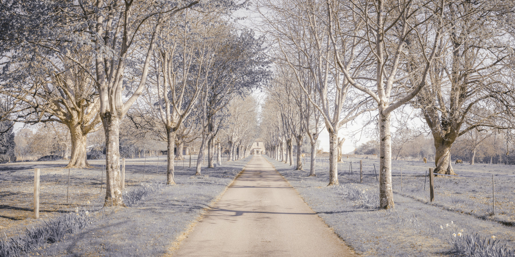 Step into a world of quiet serenity with 'Nature's Corridor'. This evocative scene captures the hushed beauty of a tree-lined path, inviting contemplation and a sense of peaceful escape. A tunnel of bare trees creates a stunning natural passage, drawing the eye towards a distant structure, hinting at untold stories and hidden tranquility. The cool, muted tones enhance the ethereal atmosphere, lending an air of timeless elegance to any room. Perfect for creating a focal point that inspires calm and reflection, this piece brings the understated majesty of the natural world into your space, offering a visual sanctuary from the everyday.