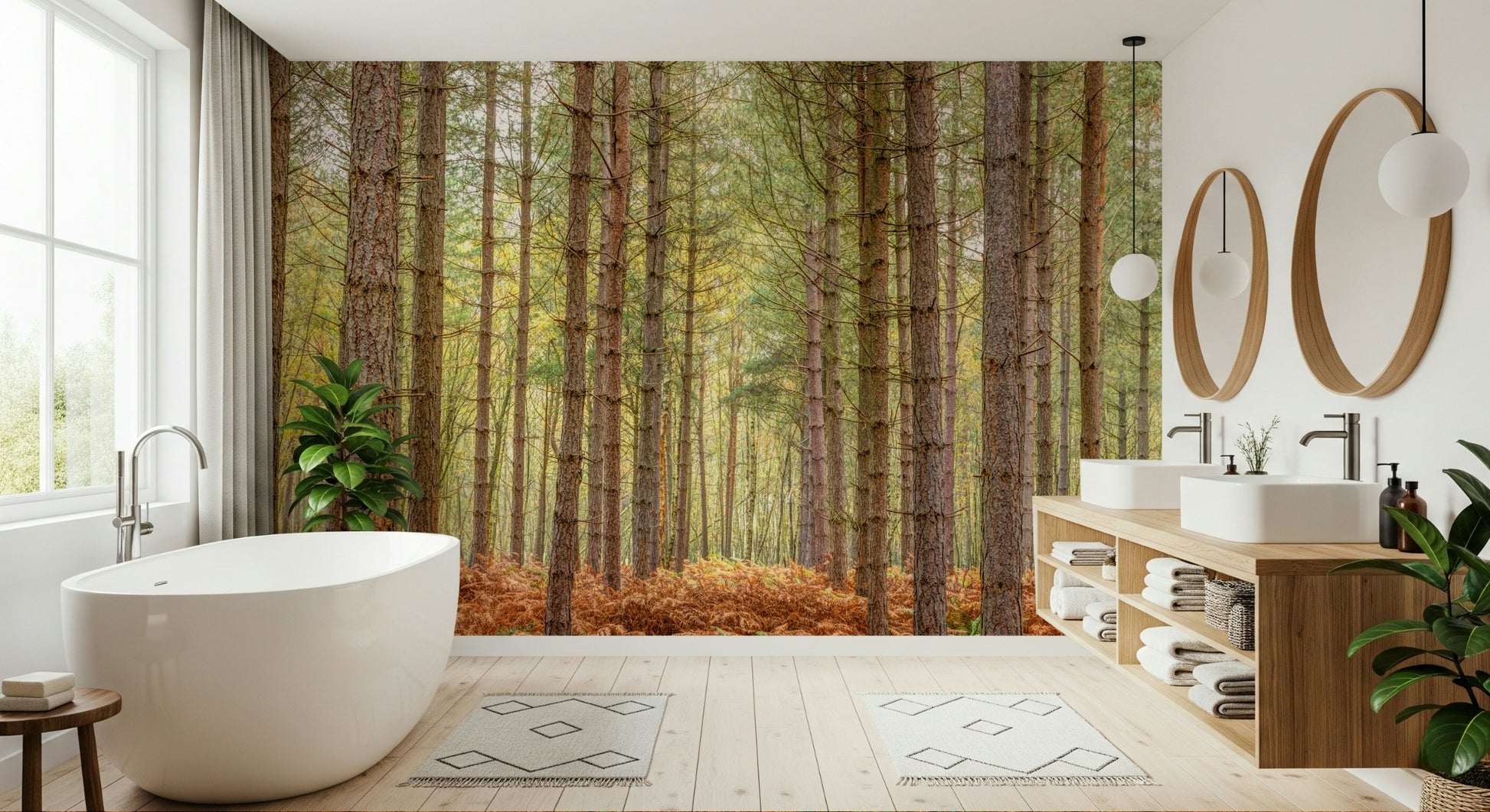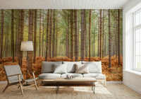 Tall trees in Autumn forest. Transform your space with a natural forest scene! This wallpaper for walls brings tranquil outdoors inside. Perfect for living rooms, bedrooms.