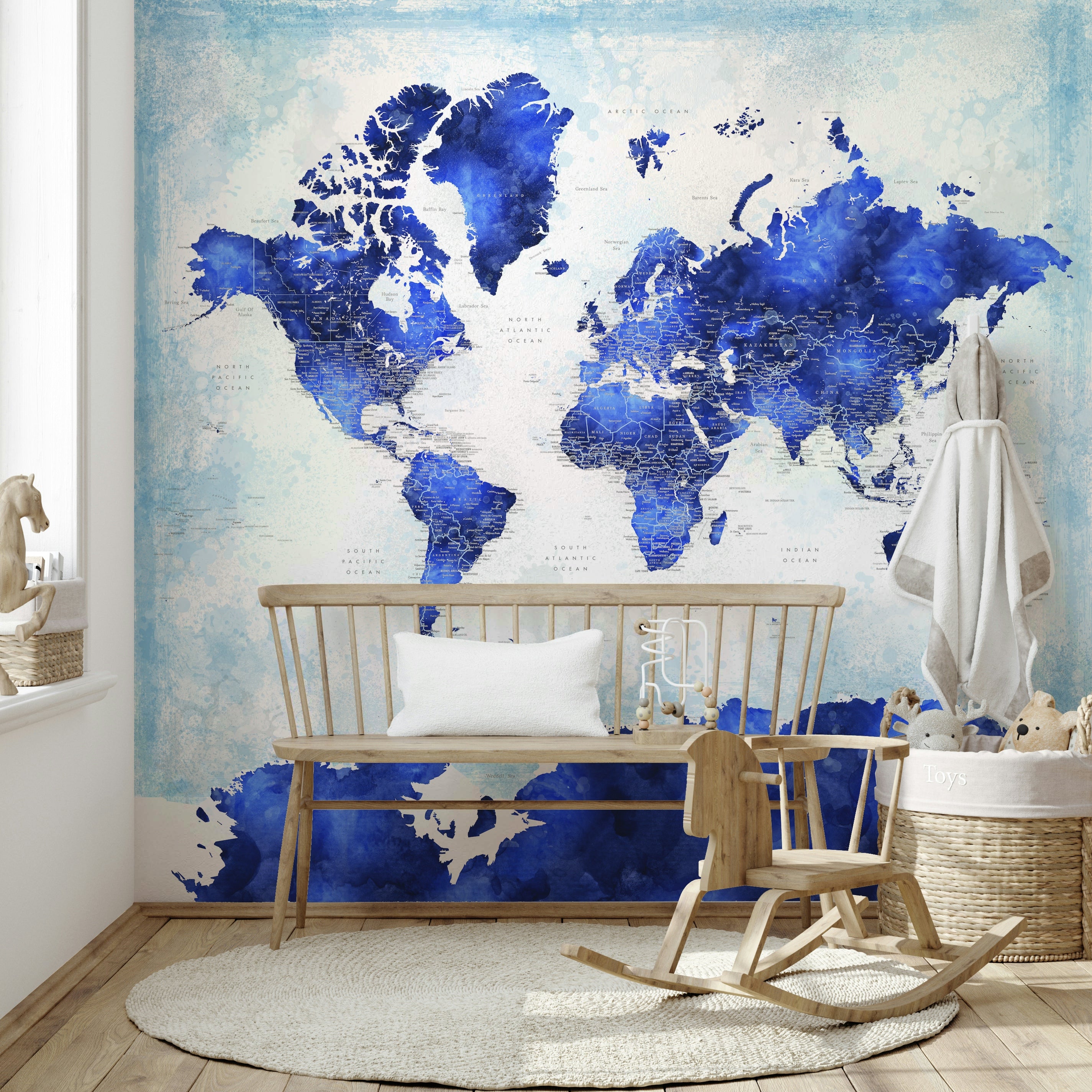 Make a bold statement with the Deep Blue Watercolor World Map Wallpaper, designed to inspire awe and wanderlust. Featuring rich, saturated shades of navy and royal blue with fluid watercolor textures, this mural adds depth and drama to any room. Every country and city is carefully labeled, making it as functional as it is striking. Ideal for modern offices, creative studios, living rooms, or travel-themed interiors, it brings sophistication and global flair to your walls. Available in peel-and-stick or traditional wallpaper options, it’s easy to install and eco-friendly. Elevate your space with this stunning map in timeless deep blue.