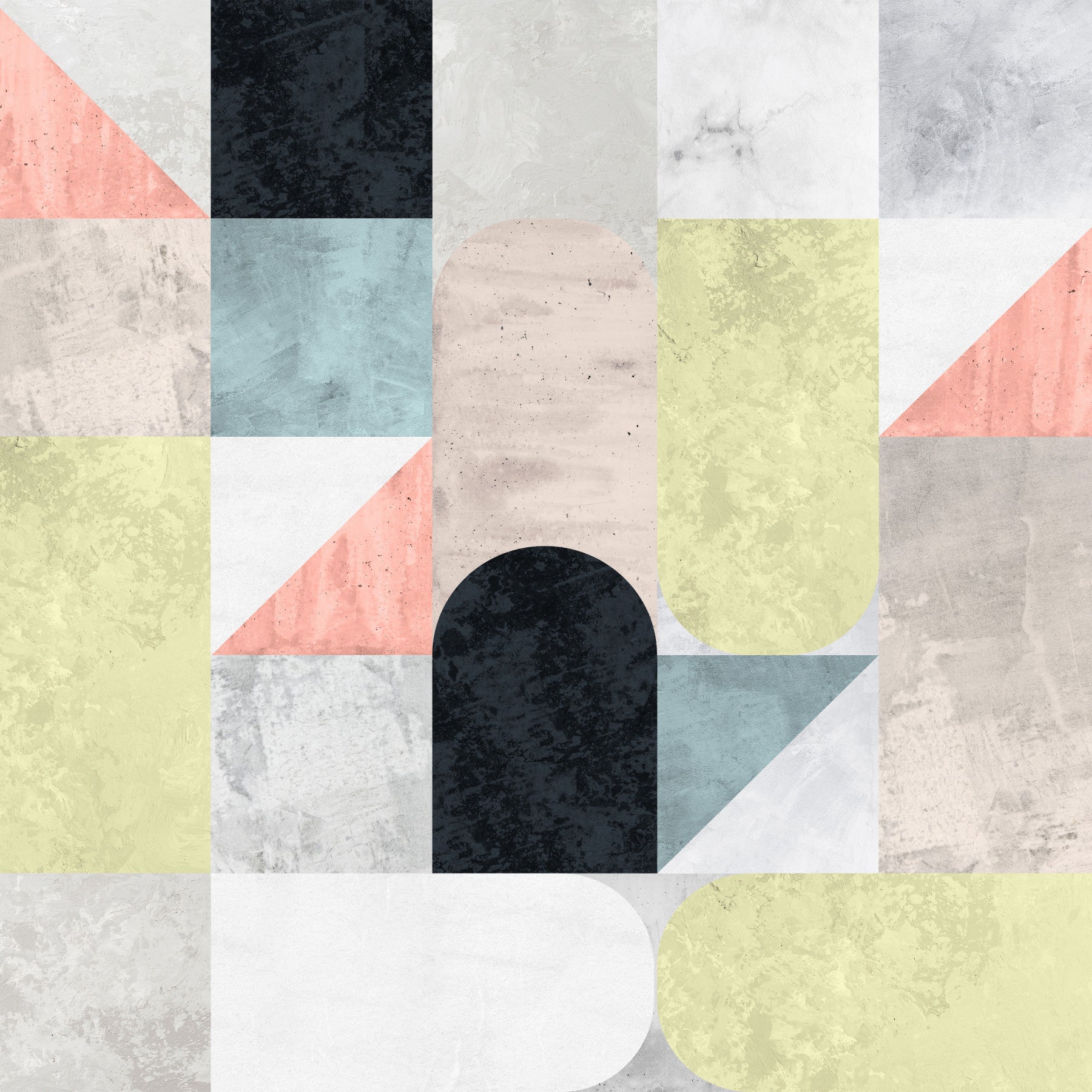 This Neo Modern wallpaper design showcases a captivating interplay of geometric shapes and textured surfaces. Subtle pastel hues of peach, mint, and pale yellow contrast beautifully against muted greys and a deep charcoal, creating a sophisticated and calming atmosphere. The use of varied geometric forms – triangles, rectangles, and rounded arches – adds a touch of playful dynamism to the overall composition. The raw, slightly distressed textures of the surfaces evoke a sense of understated elegance, characteristic of contemporary design. This wallpaper is perfect for adding a touch of minimalist sophistication to any modern space, offering a calming yet visually engaging backdrop for your digital devices.