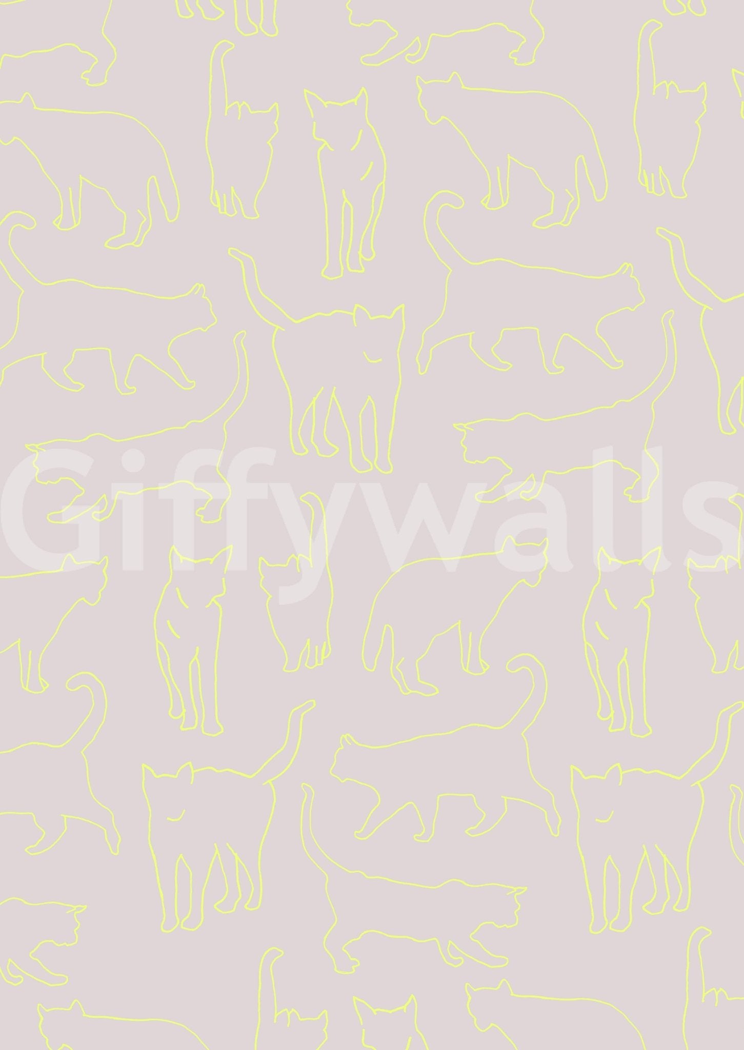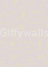 This delightful wallpaper features a seamless pattern of feline silhouettes in a vibrant neon yellow against a calm background. The minimalist design offers a modern twist to animal-themed decor, lending a playful yet stylish touch to any room. Use this wallpaper for walls in a nursery, playroom, or even a fun accent wall in a living room to brighten up your space. The light color palette complements various interiors.