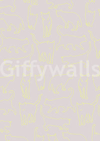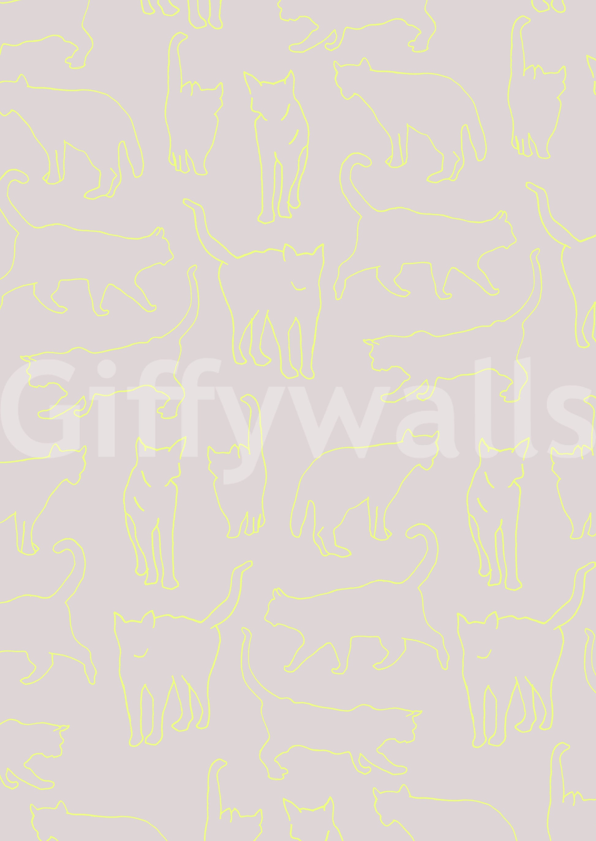 This delightful wallpaper features a seamless pattern of feline silhouettes in a vibrant neon yellow against a calm background. The minimalist design offers a modern twist to animal-themed decor, lending a playful yet stylish touch to any room. Use this wallpaper for walls in a nursery, playroom, or even a fun accent wall in a living room to brighten up your space. The light colour palette complements various interiors.