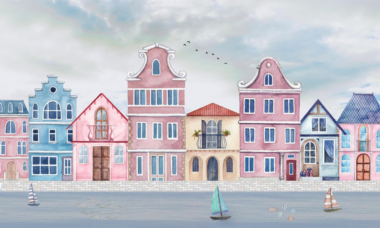 Urban-inspired wallpaper featuring charming stacked buildings.
