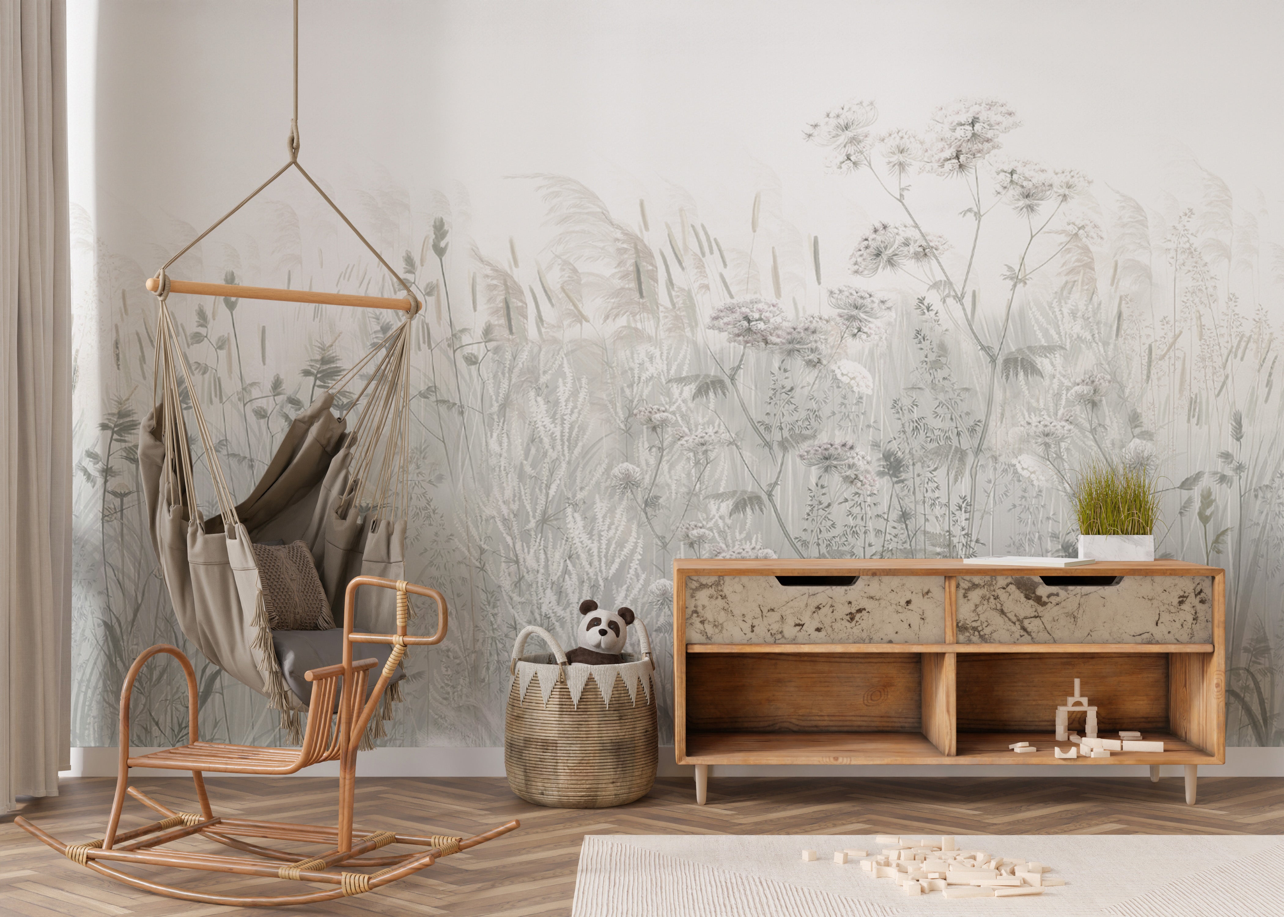 Scandinavian wildflower mural in soft color palette