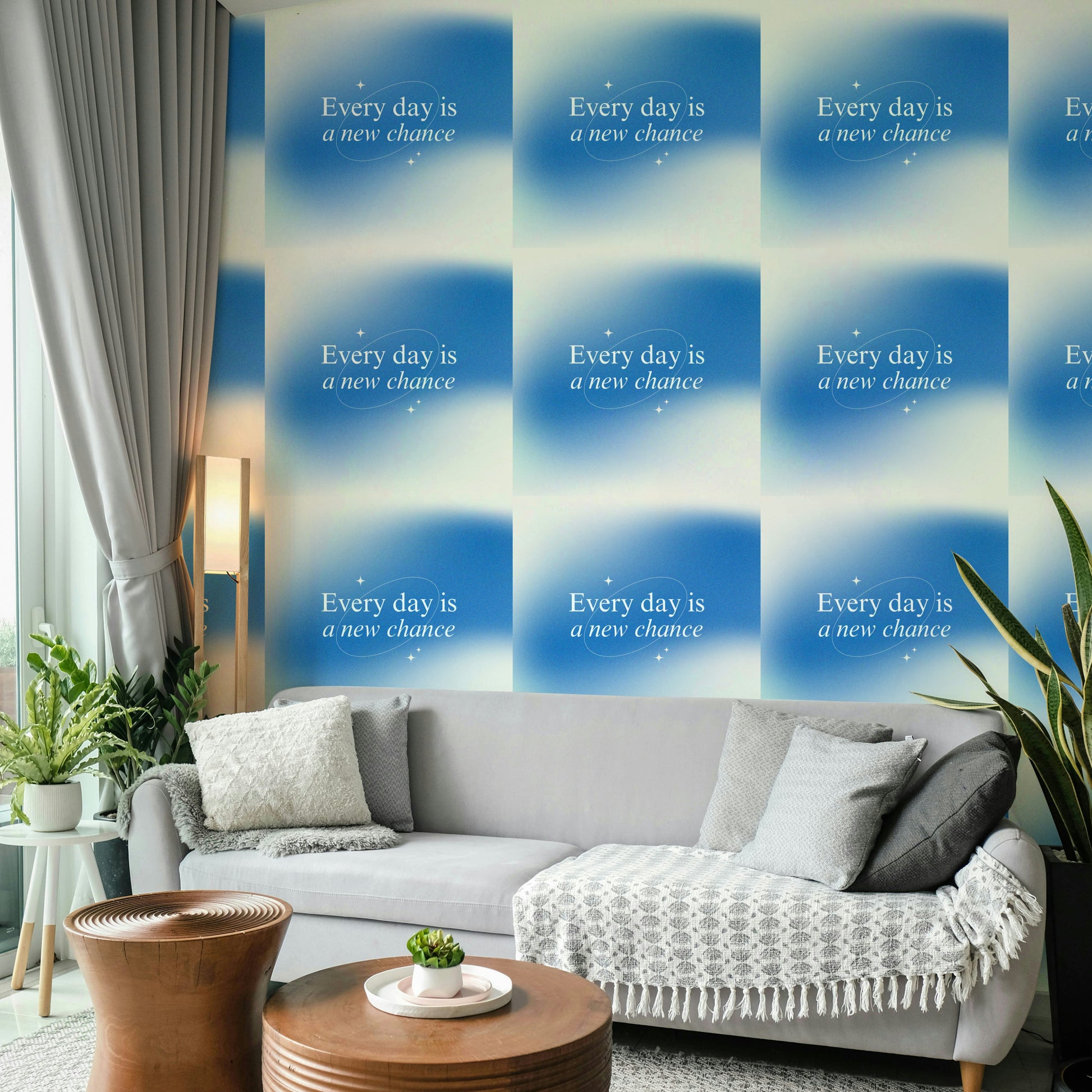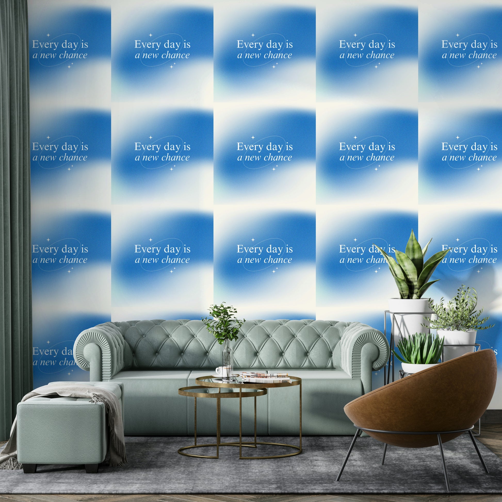 Embrace the serenity of a brand new day with this calming wallpaper. A soft, gradient blue sky, reminiscent of a hopeful dawn, forms the backdrop for the inspiring message: 'Every day is a new chance'. Delicate, sparkling stars add a touch of magic, enhancing the feeling of fresh beginnings and limitless possibilities. This minimalist design is perfect for those seeking a peaceful and motivating start to each day, promoting positivity and the pursuit of dreams. The subtle color palette and clean typography create a tranquil atmosphere, ideal for a desktop or mobile screen.