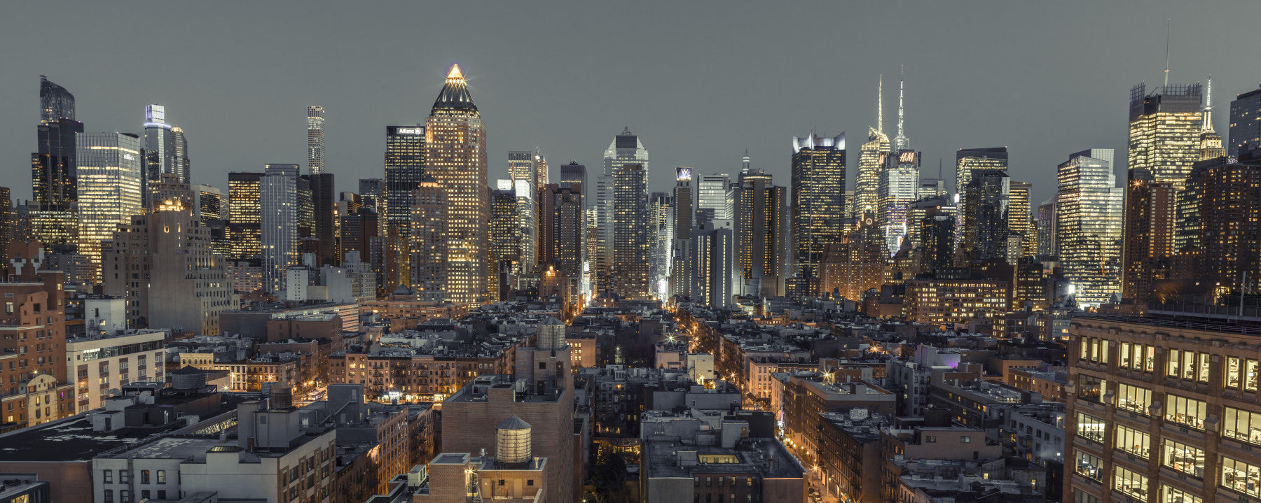 NYC nightscape mural featuring skyscrapers and bright city lights.