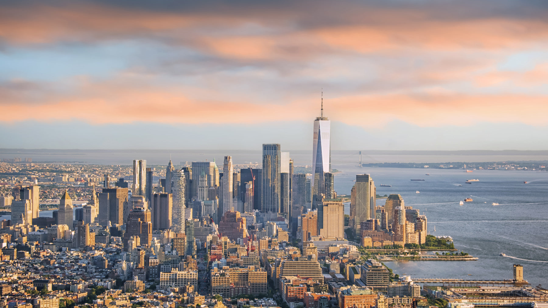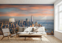 Transform your space with the vibrant energy of New York City. This wallpaper for walls captures a panoramic view of the iconic skyline at dawn, featuring the majestic One World Trade Center and the sprawling cityscape bathed in the warm glow of sunrise. The sky, a soft blend of peach and azure, complements the earth-toned buildings below. This design brings a sense of urban sophistication to living rooms, home offices, or even bedrooms. The elevated perspective adds depth, creating an immersive and inspiring ambience.
