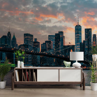 Transform your living space with a stunning vista of New York City at twilight. This wallpaper for walls showcases the iconic skyline, complete with the Brooklyn Bridge, bathed in the warm glow of the setting sun. A blend of deep blues, greys, and fiery oranges creates a dramatic yet calming effect. The city lights twinkle against the darkening sky, offering a captivating focal point. Ideal for living rooms, bedrooms, or home offices, this wall décor injects urban sophistication and modern elegance into any room. It creates depth and visual interest, making smaller spaces appear larger.